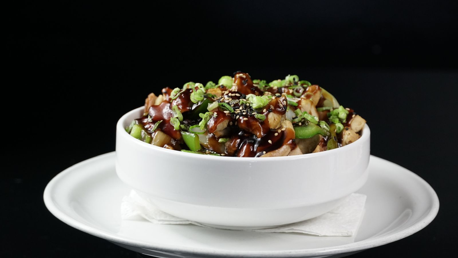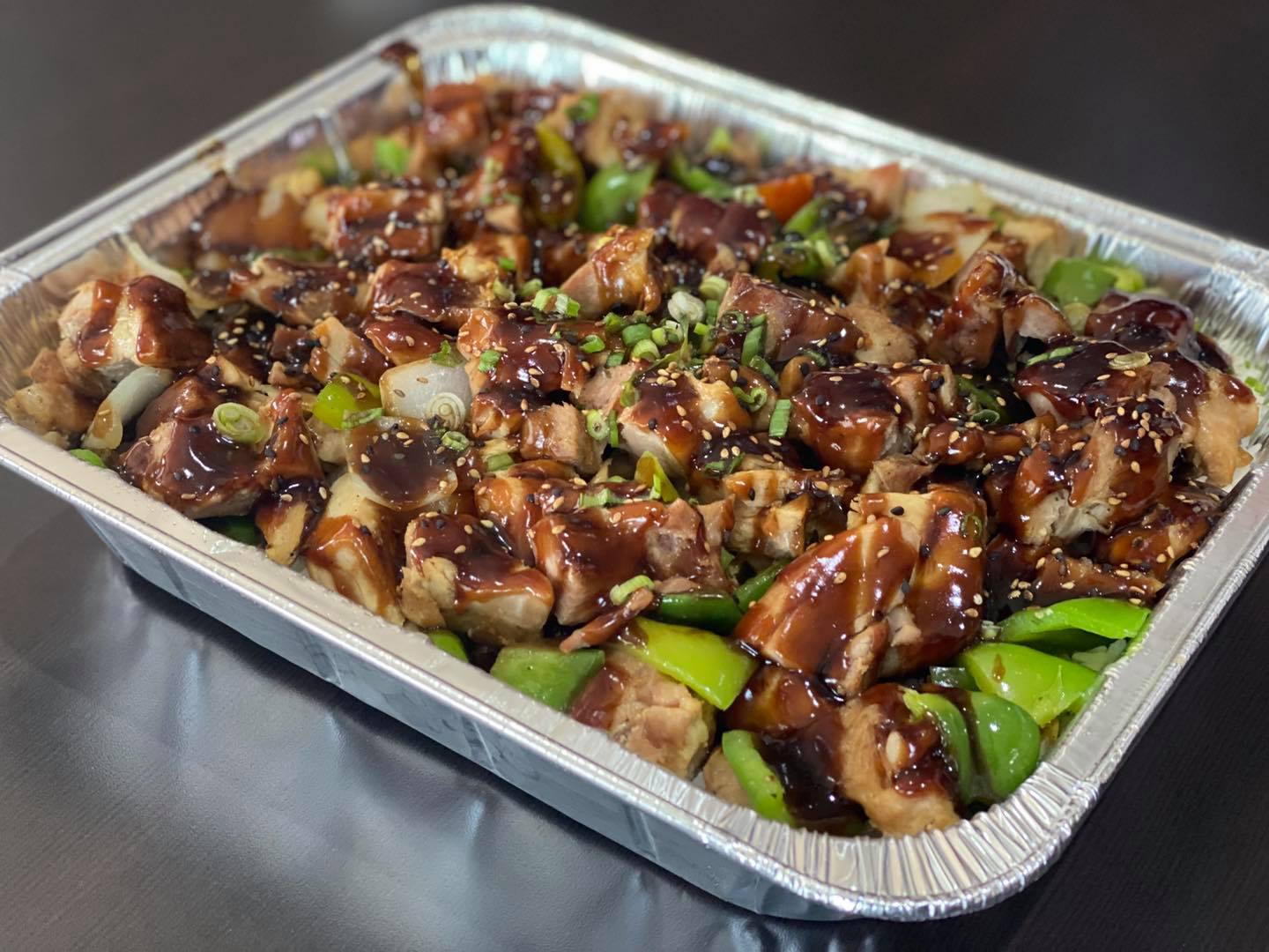 Cama de arroz blanco, morrón, cebolla, pollo deshuesado, bañado en salsa teriyaki.