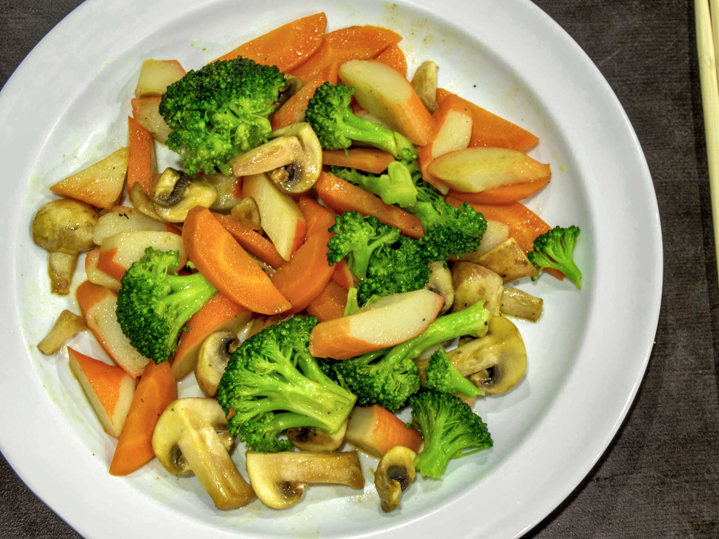 Brócoli, zanahoria, champiñon, surimi a la plancha.