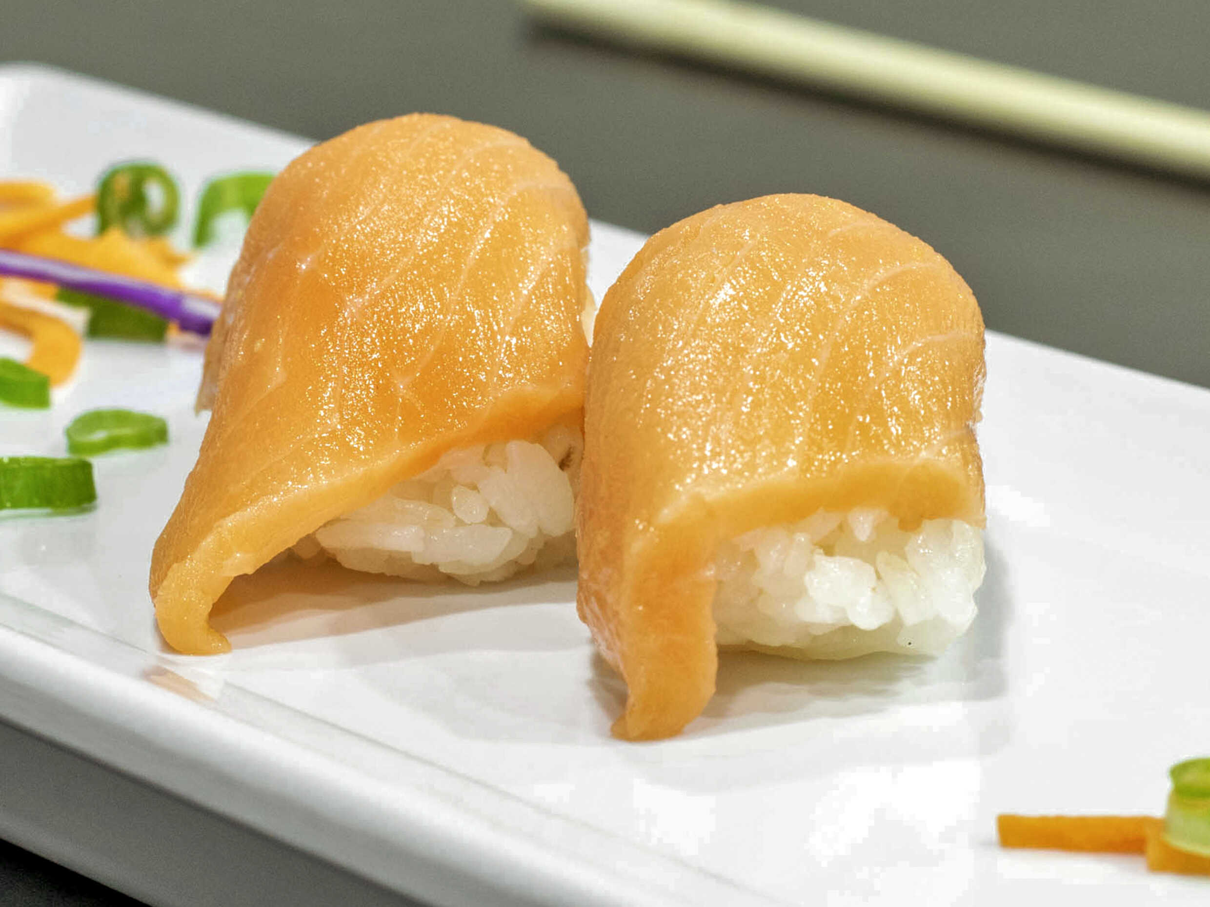 Camarón, aguacate, queso Philadelphia, forrado de salmón, con topping de cebollín y pulpo a la plancha.