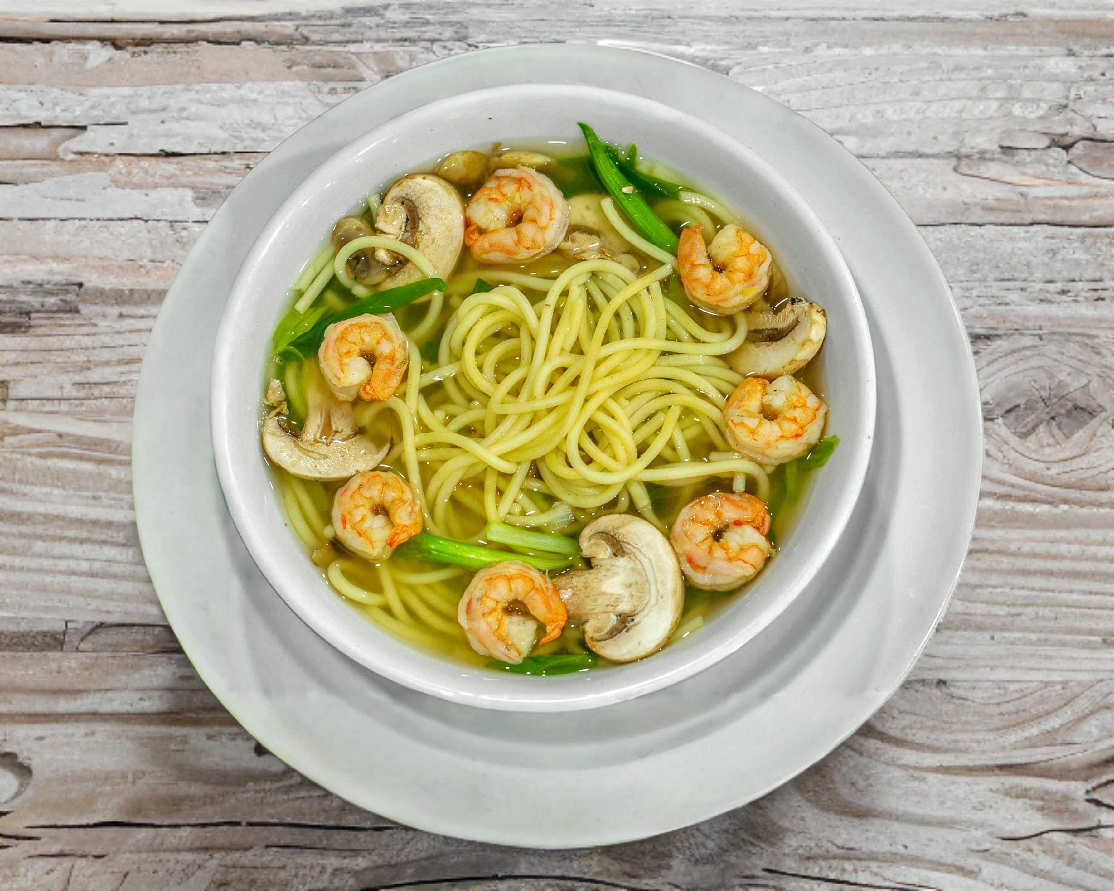 Camarón, cebollín, champiñones y pasta udon.