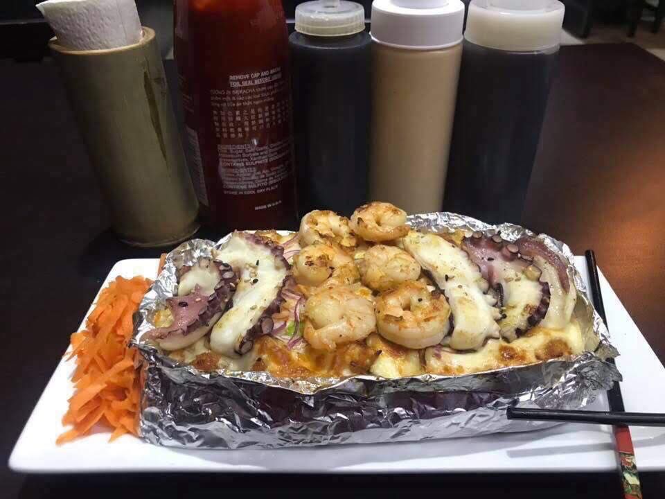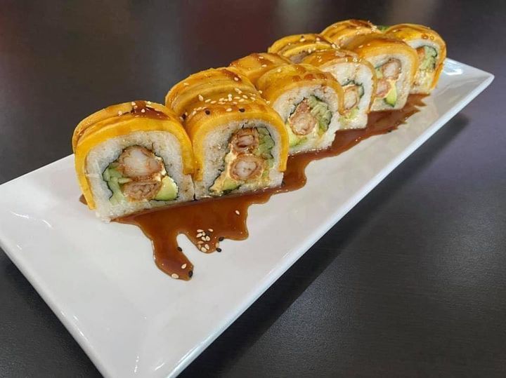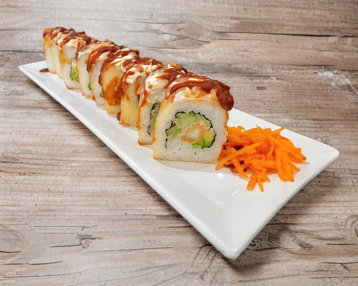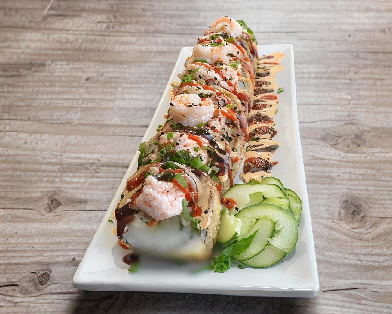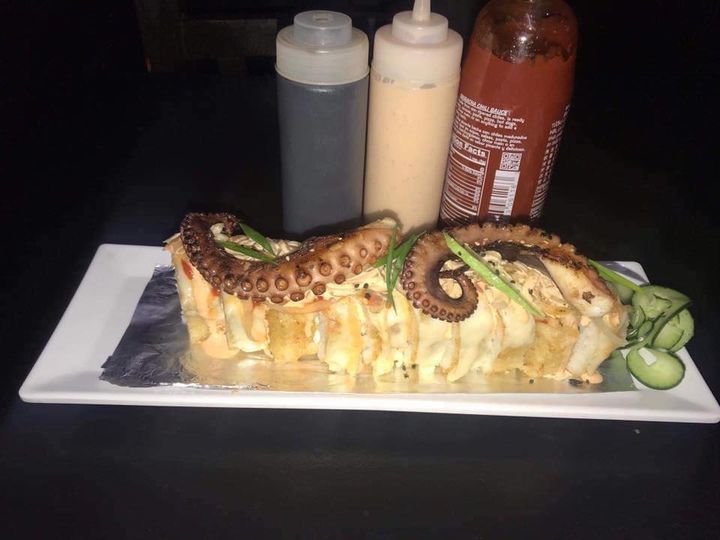 Camarón, tocino, queso Philadelphia, aguacate cebollín, forrado de queso monterrey, bañado con salsa teriyaki y topping de pulpo.