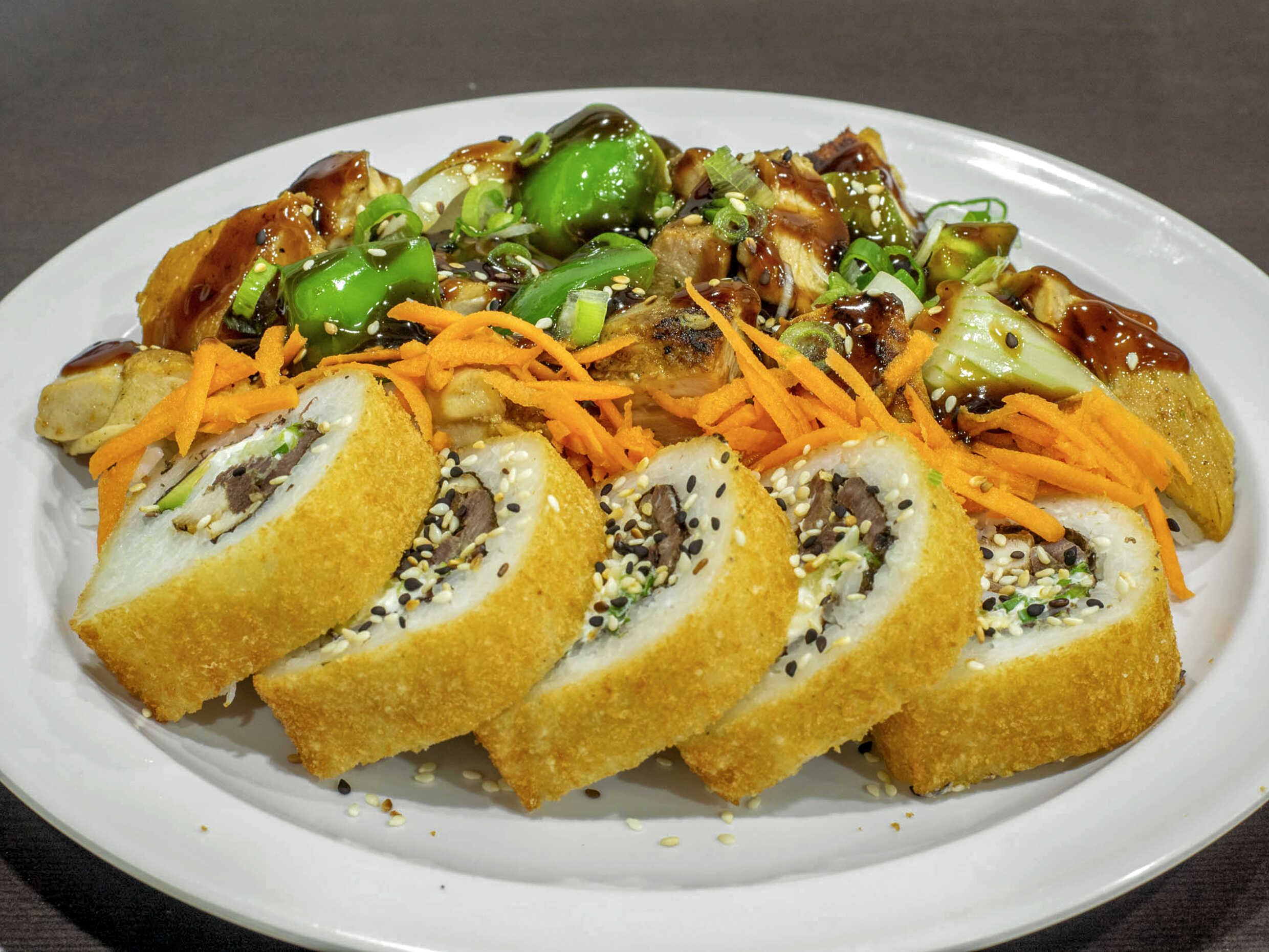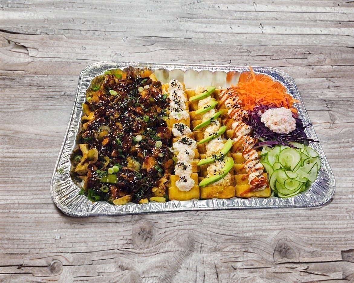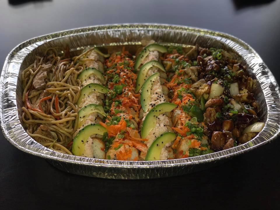 4 Rollos california, 1 de pollo, 1 de res, 1 de surimi y 1 de camarón. Topping de salsas de la casa, tampico, zanahoria y rajas de aguacate. Porción de pasta yakisoba de pollo y porción de teriyaki.