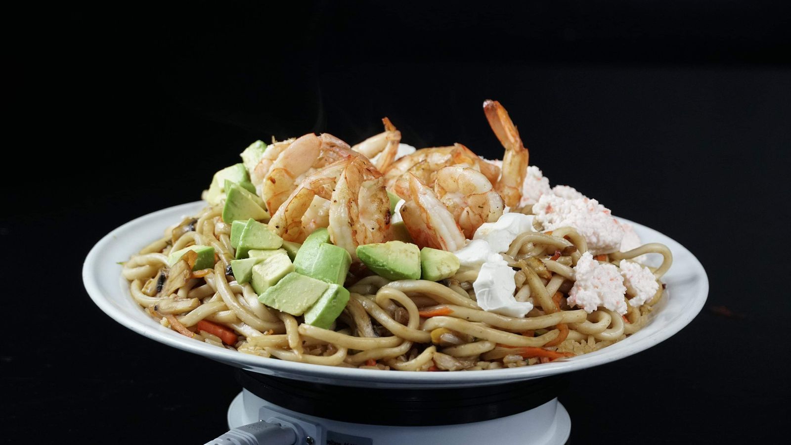 Arroz frito, Philadelphia, aguacate, tampico y camarones a la plancha.