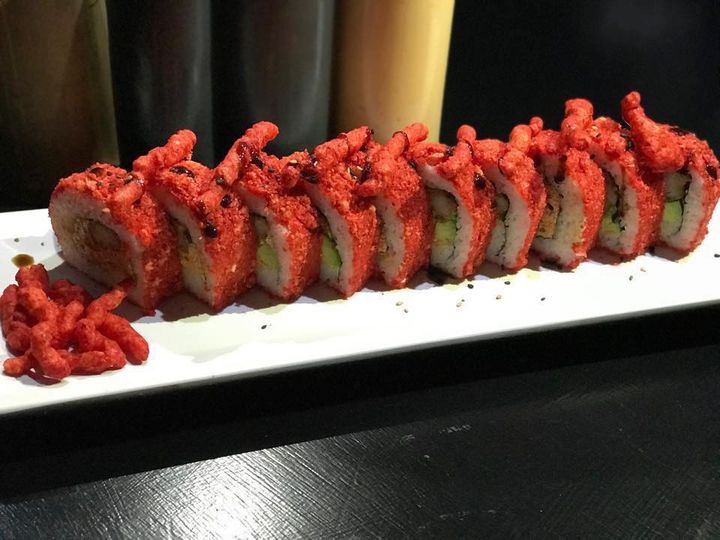 Pasta Dragon, camarón empanizado aguacate, chetos, forrado de Sabritas, salceado en salsa picosa.