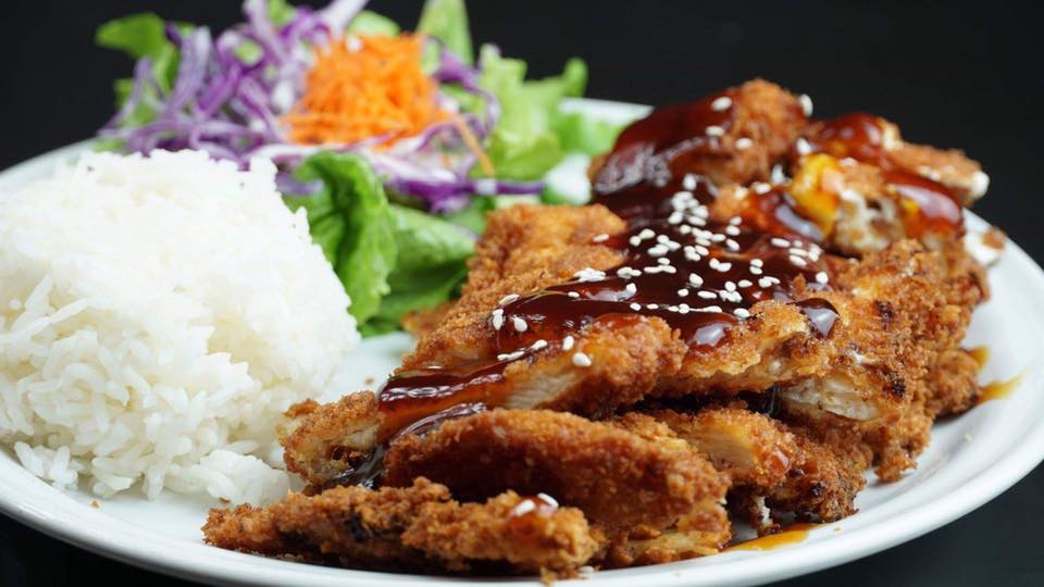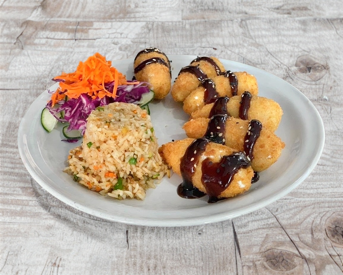 Pechuga empanizada, rellena de Philadelphia, bañada con teriyaki y arroz blanco.