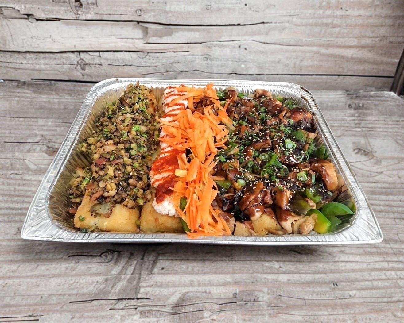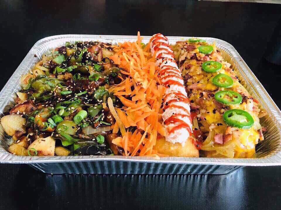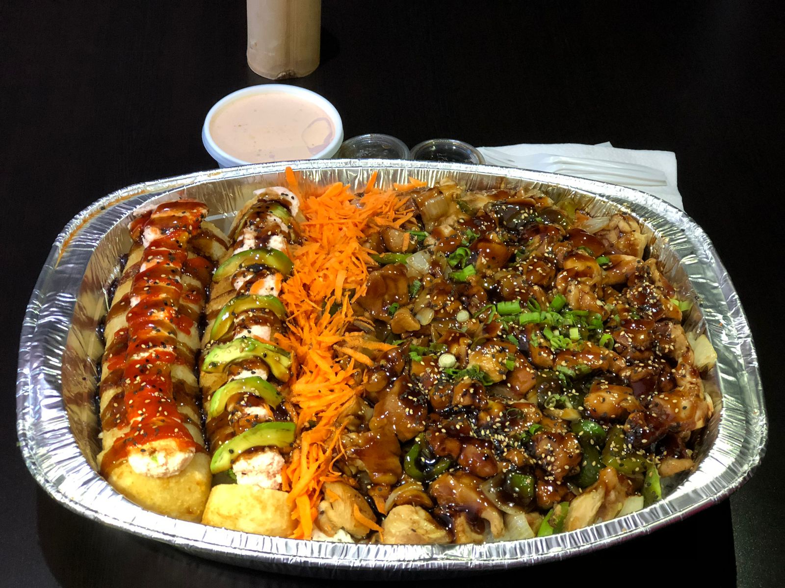 Mitad teriyaki de pollo, 1 rollo nacho nacho, 1 rollo calexico.