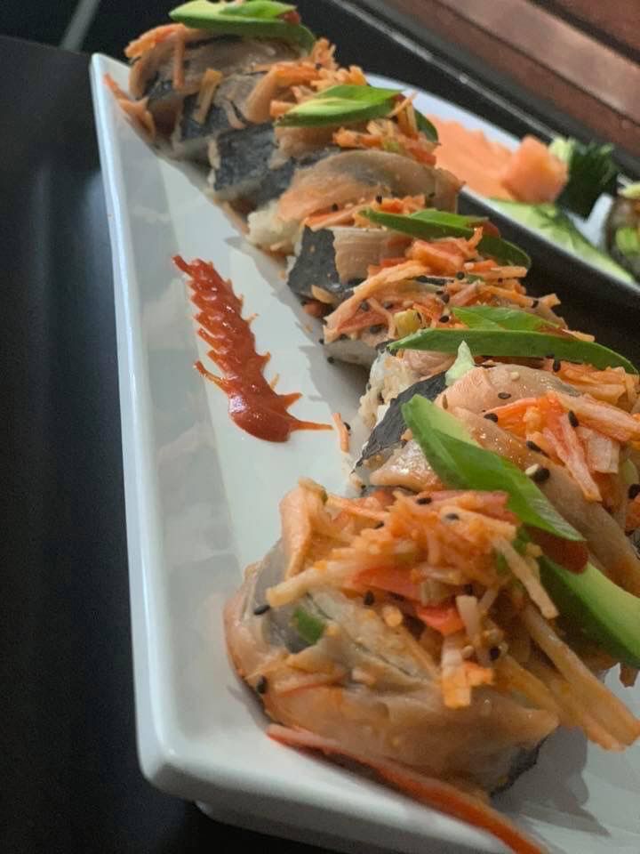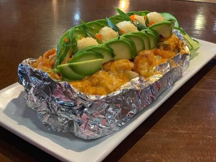 Camarón a la plancha, aguacate queso Philadelphia, forrado de cebolla caramelizada, bañado con aderezo chipotle y furikake (condimento de camarón).