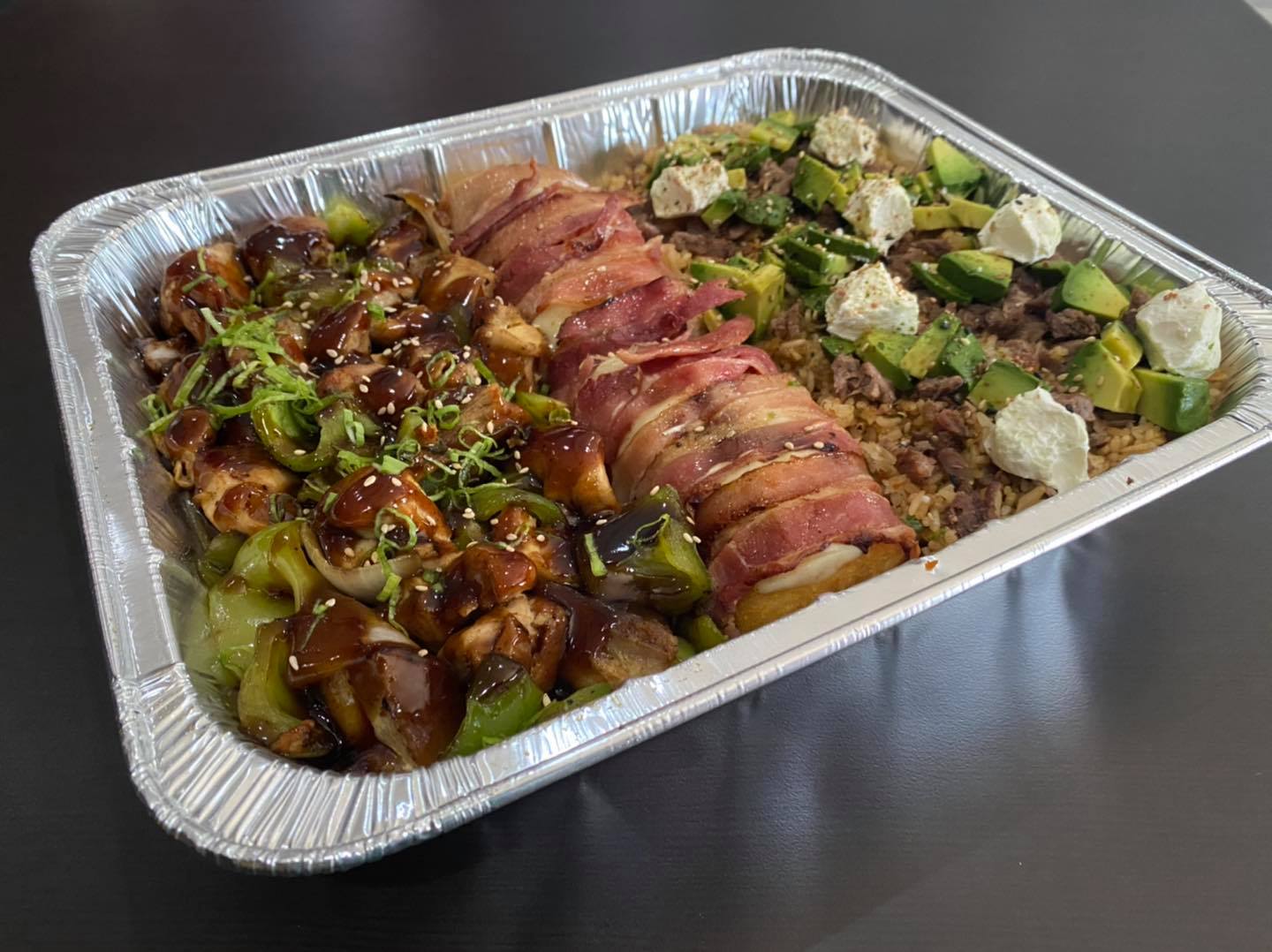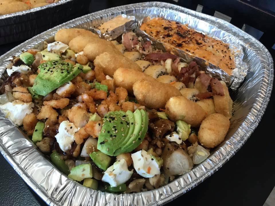 Tocino, aguacate y queso Philadelphia, topping de queso monterrey, cebollín, salsas, camarón empanizado, bolitas de queso Philadelphia empanizadas, aguacate, masago y siracha.