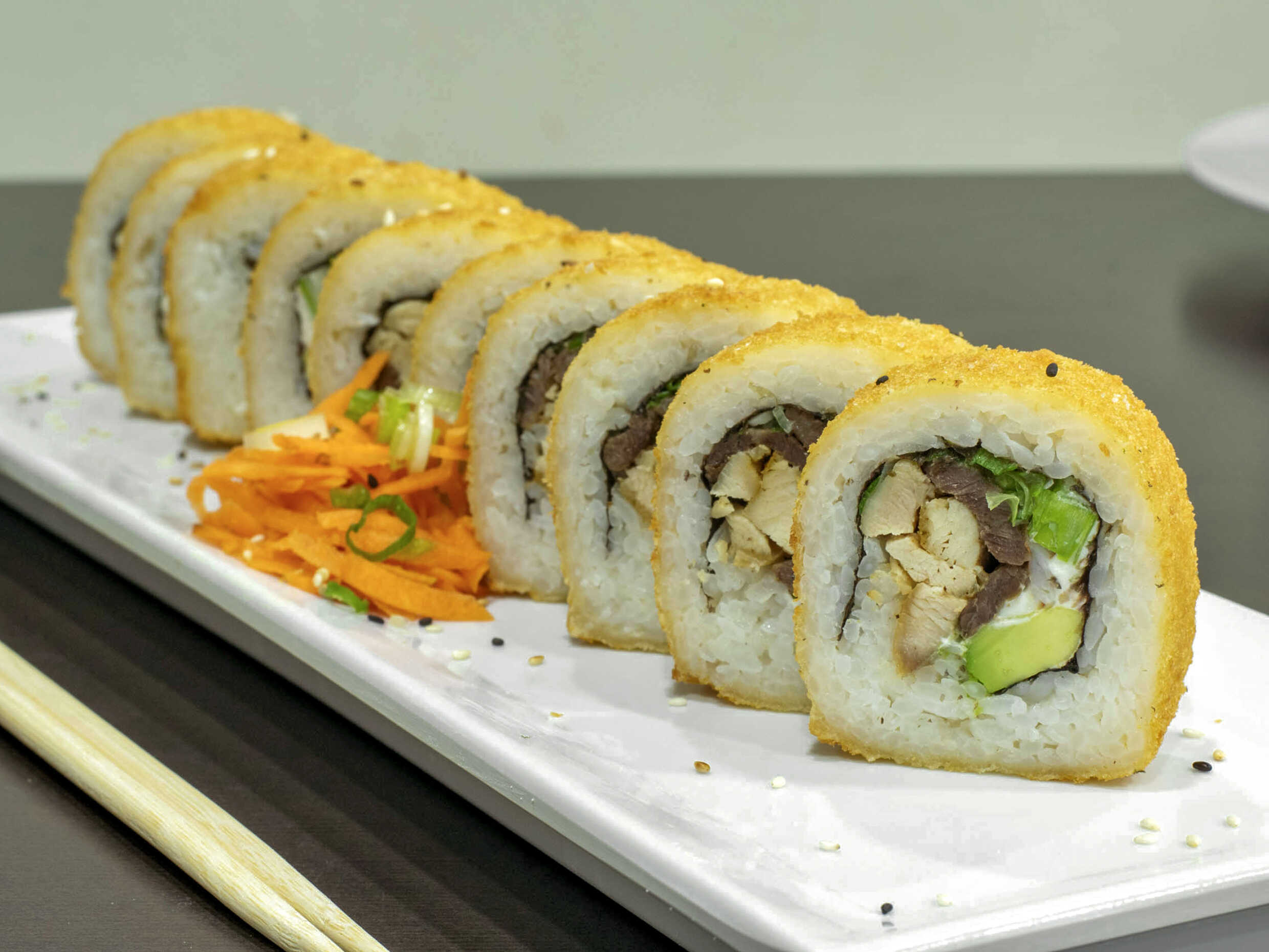 Philadelphia, carne, tempura, cebollín, forrado de aguacate, toping especial.
