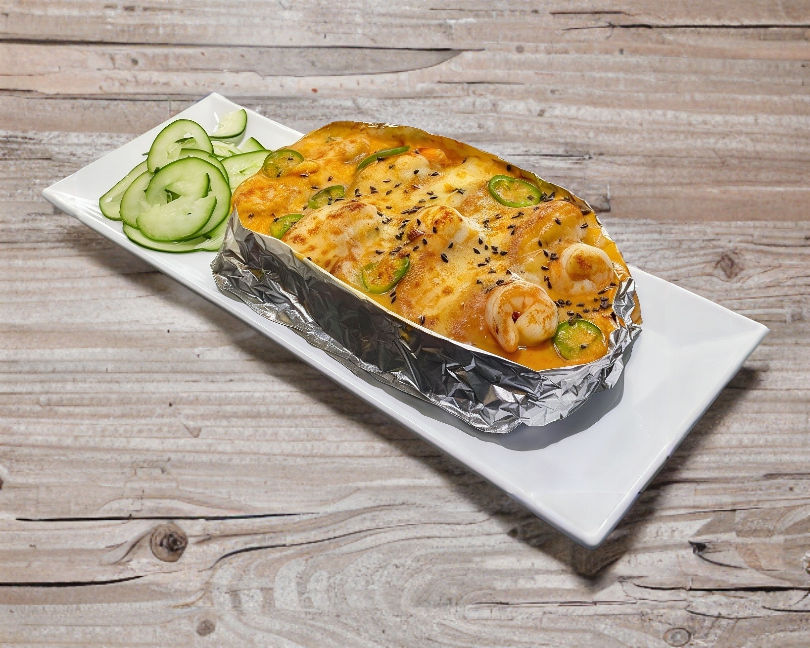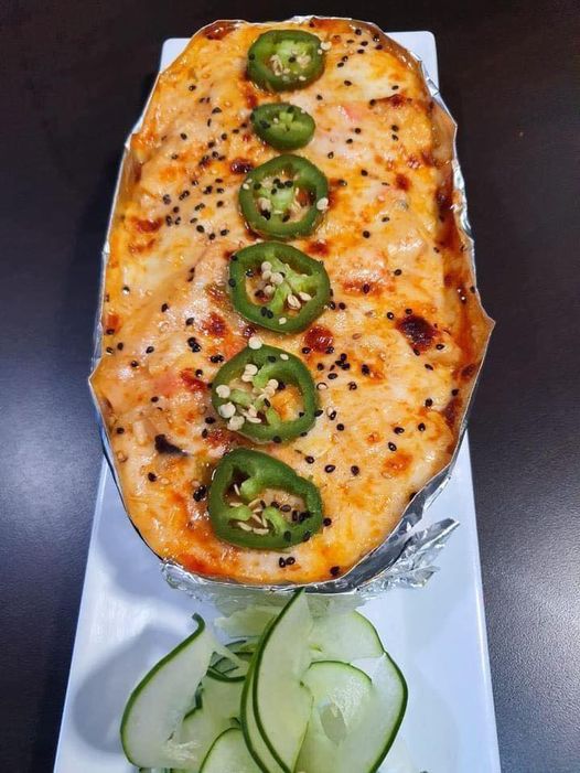 Surimi, aguacate y pepino, gratinado con queso monterrey y trozos de tocino.