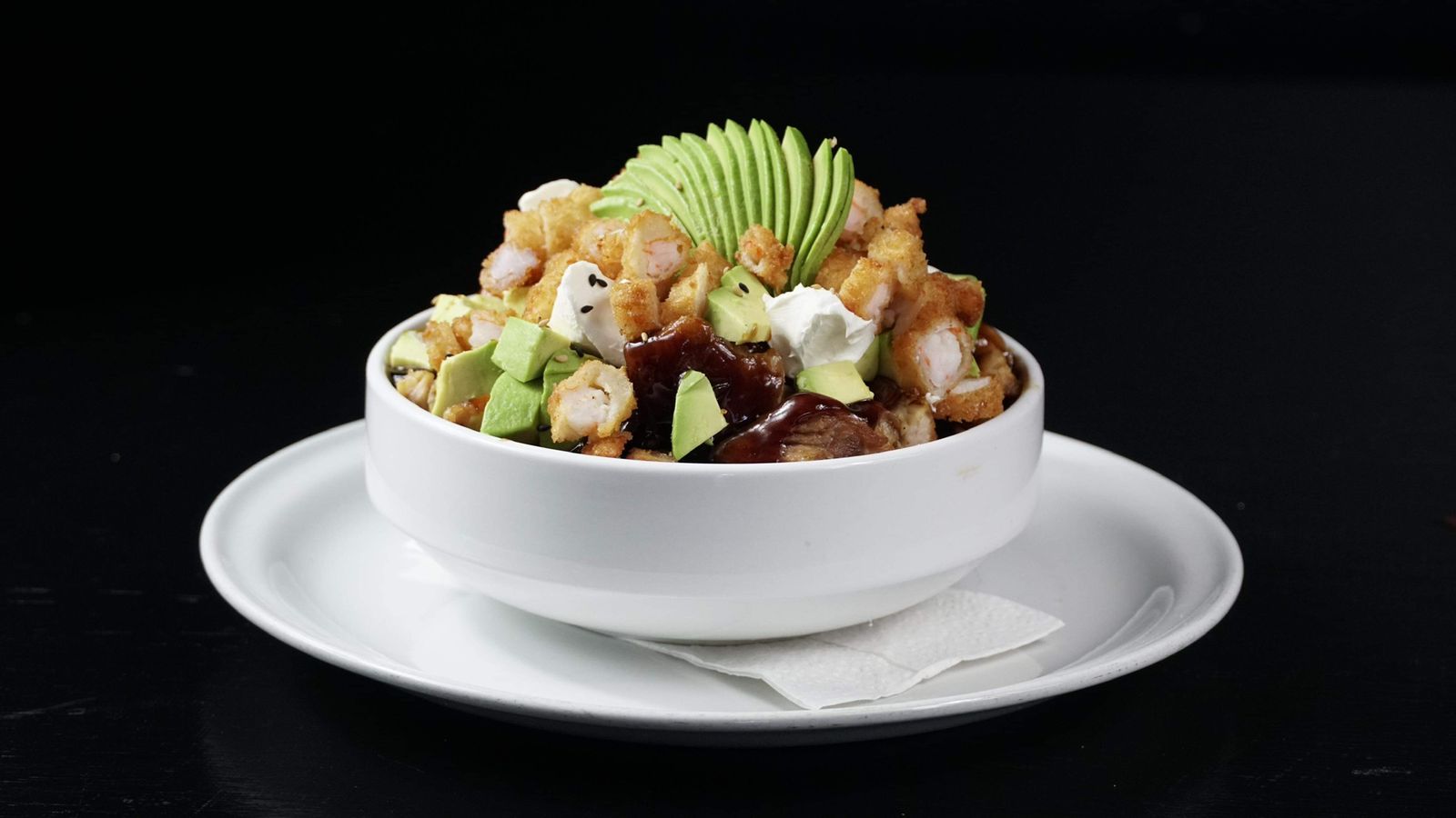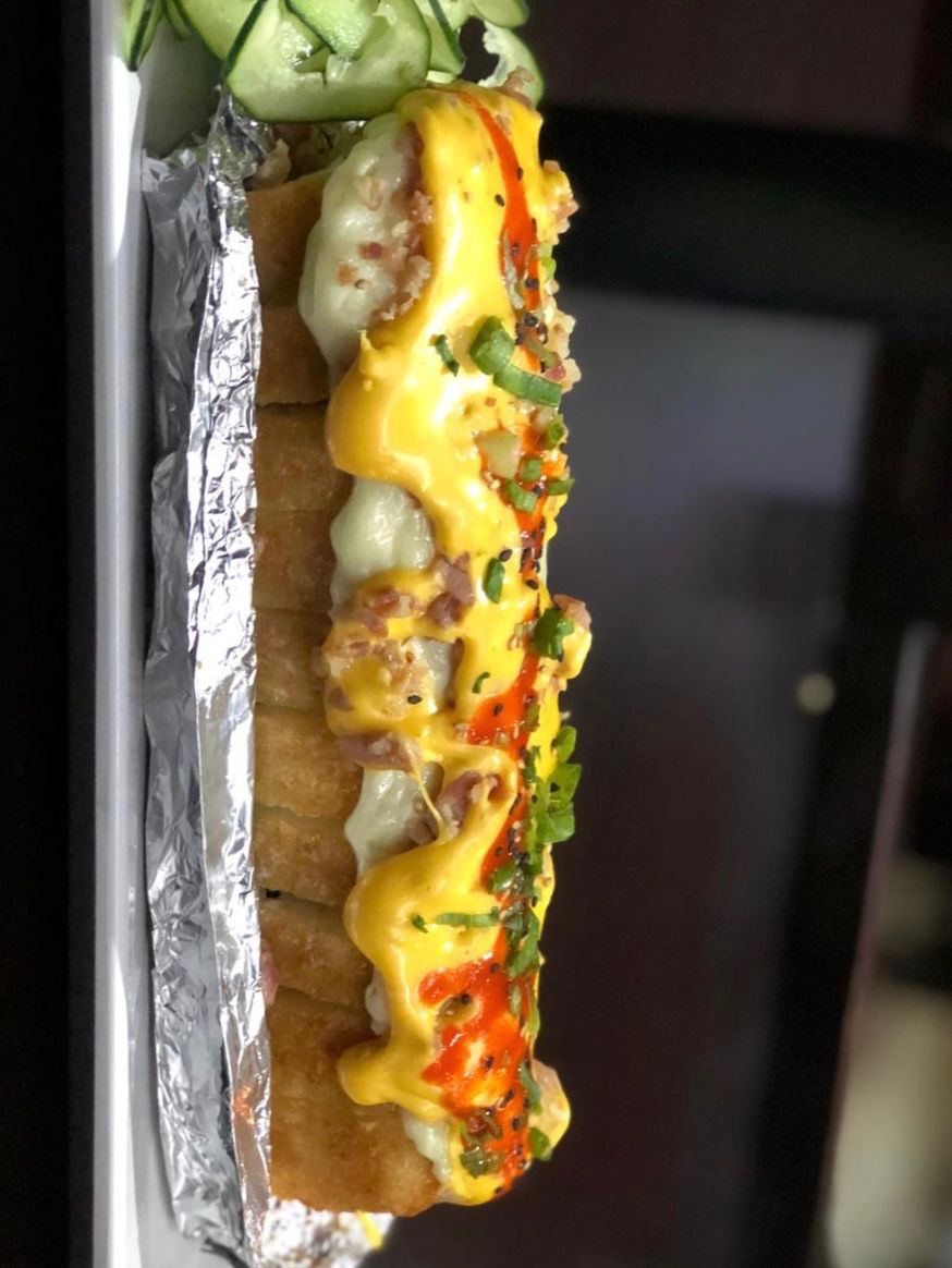 Aguacate Philadelphia, pollo, manchego, queso de nachos, tocino, shiracha y cebollín,