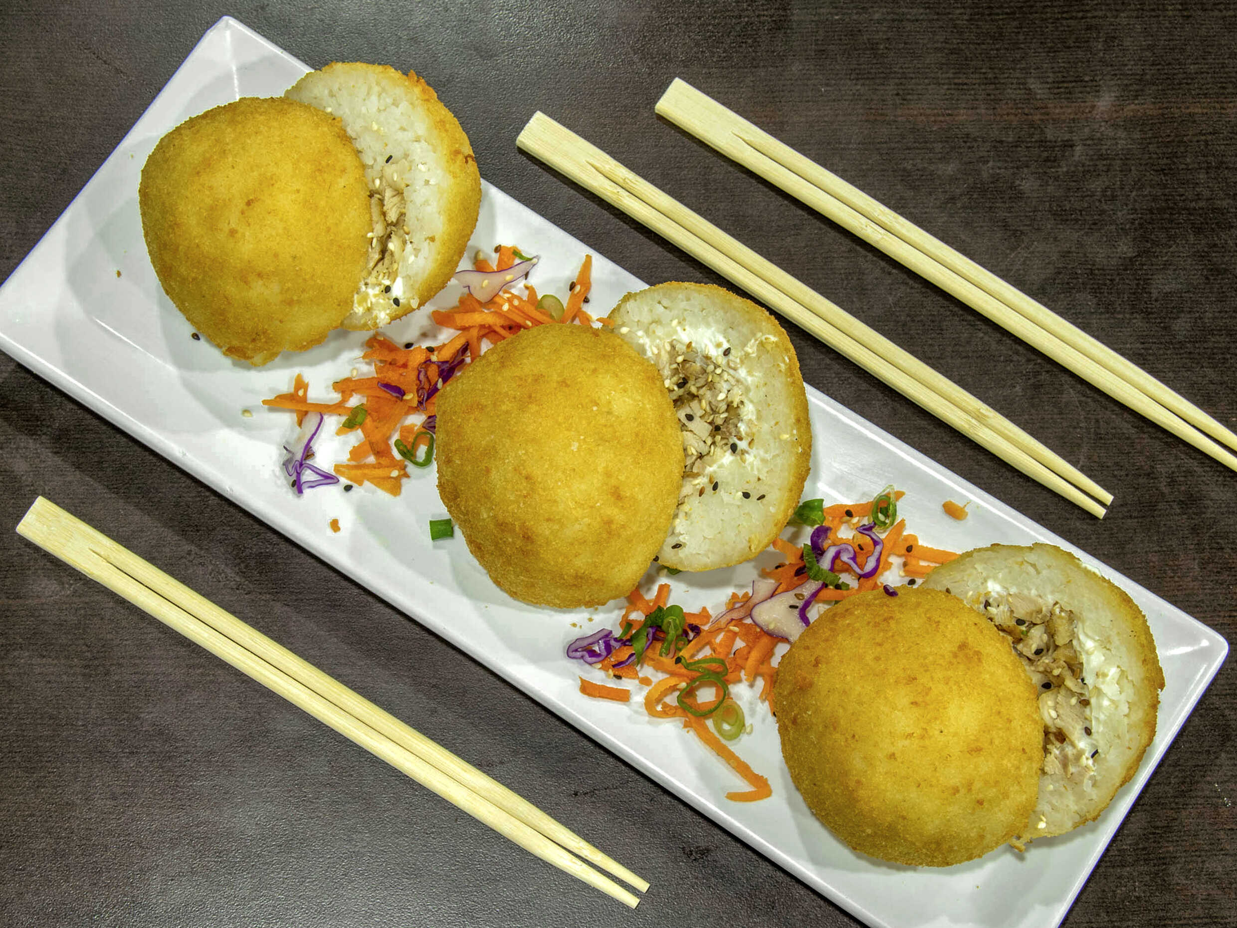 3 Bolas de arroz, rellena de Philadelphia. Platillo personal
