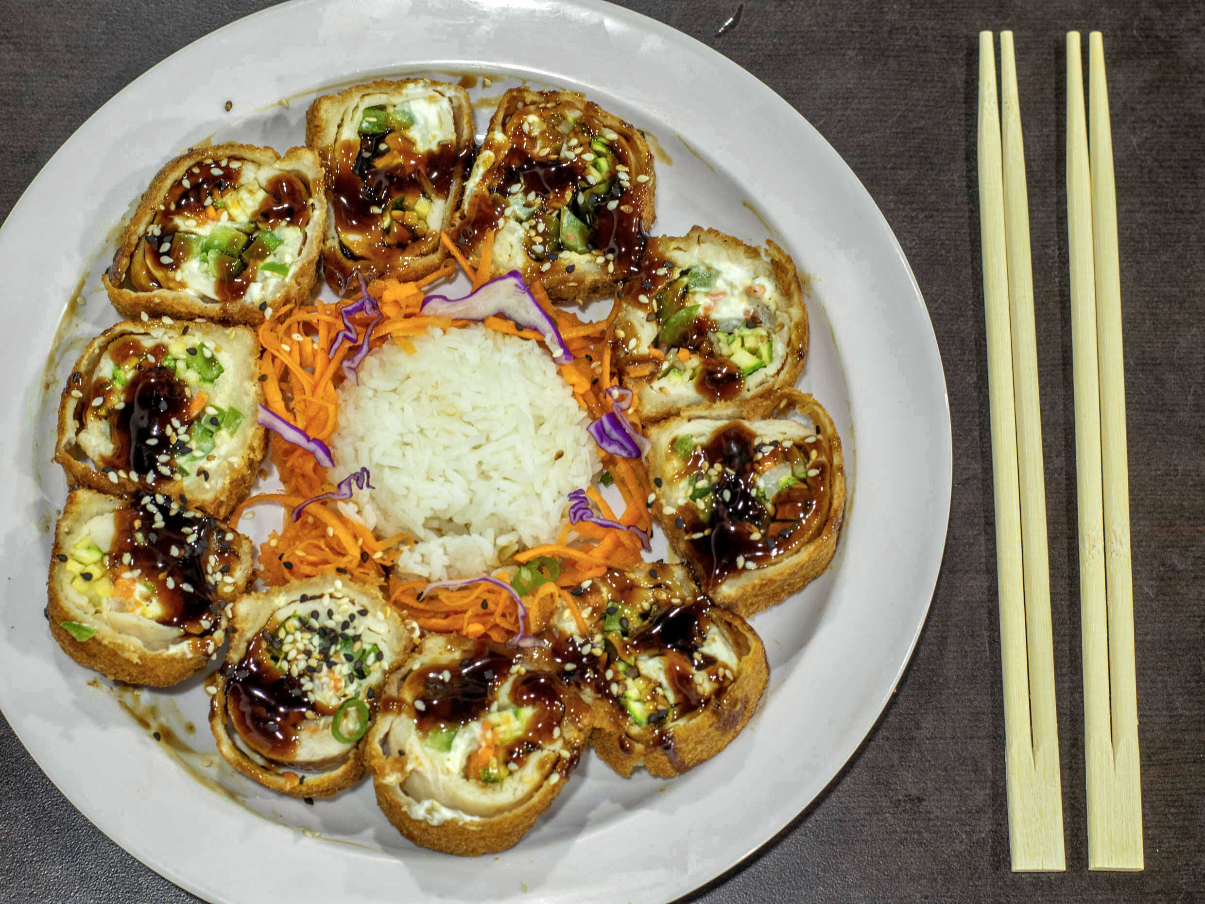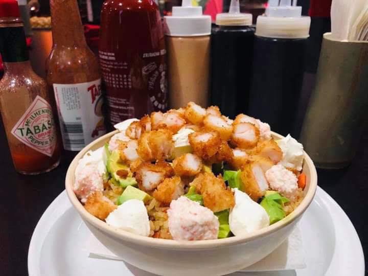 Arroz frito, verduras, Philadelphia, aguacate, camarón empanizado y tampico.