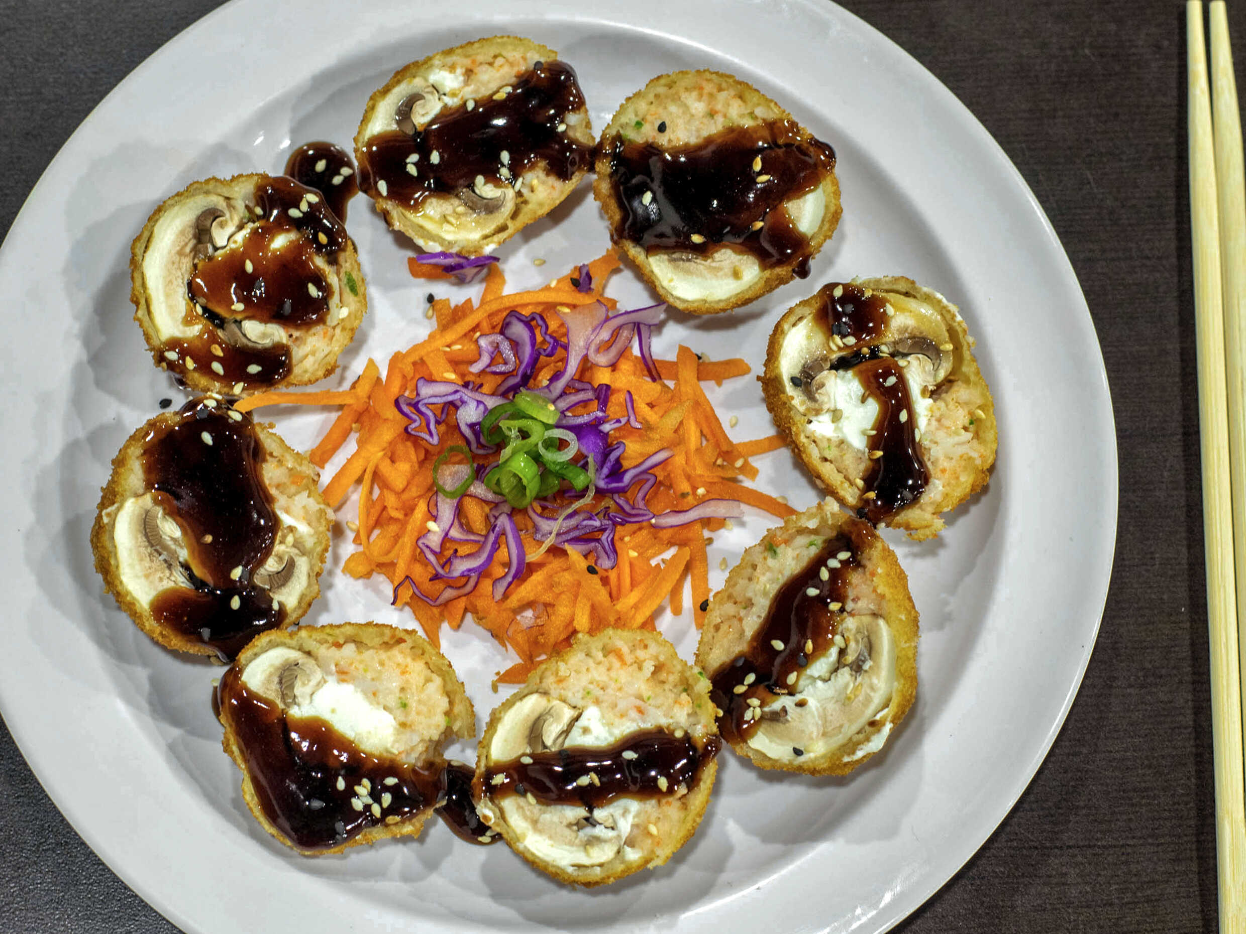 Surimi, champiñones, zanahoria, cebollín.