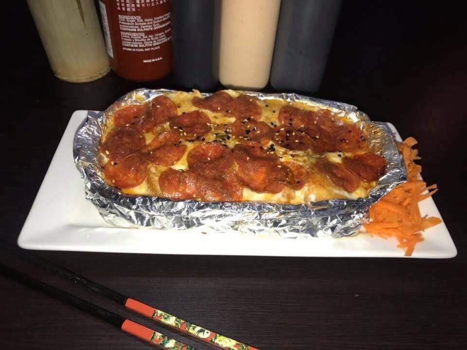 Dentro Philadelphia, aguacate, carne de pollo empanizado, toping de queso monterrey, chipotle, shiraza, cebollín, chile jalapeño y pepperoni.