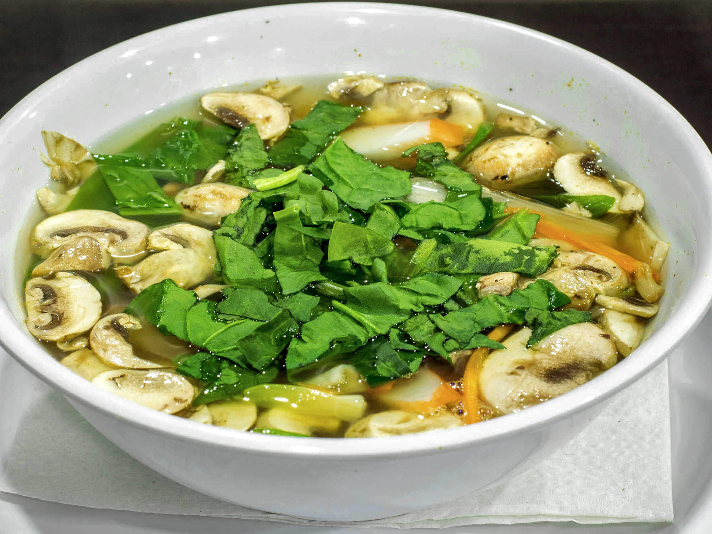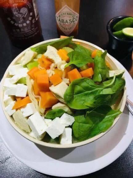 Pollo, calabaza, zanahoria, champiñón, espinaca, brócoli, queso fresco y pasta noodle.