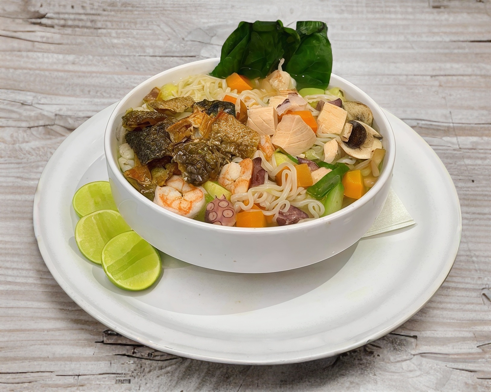Calabaza, zanahoria, champiñon, espinaca, brócoli, cebollín, pasta noodle, camarón, pulpo, salmón y piel frita.