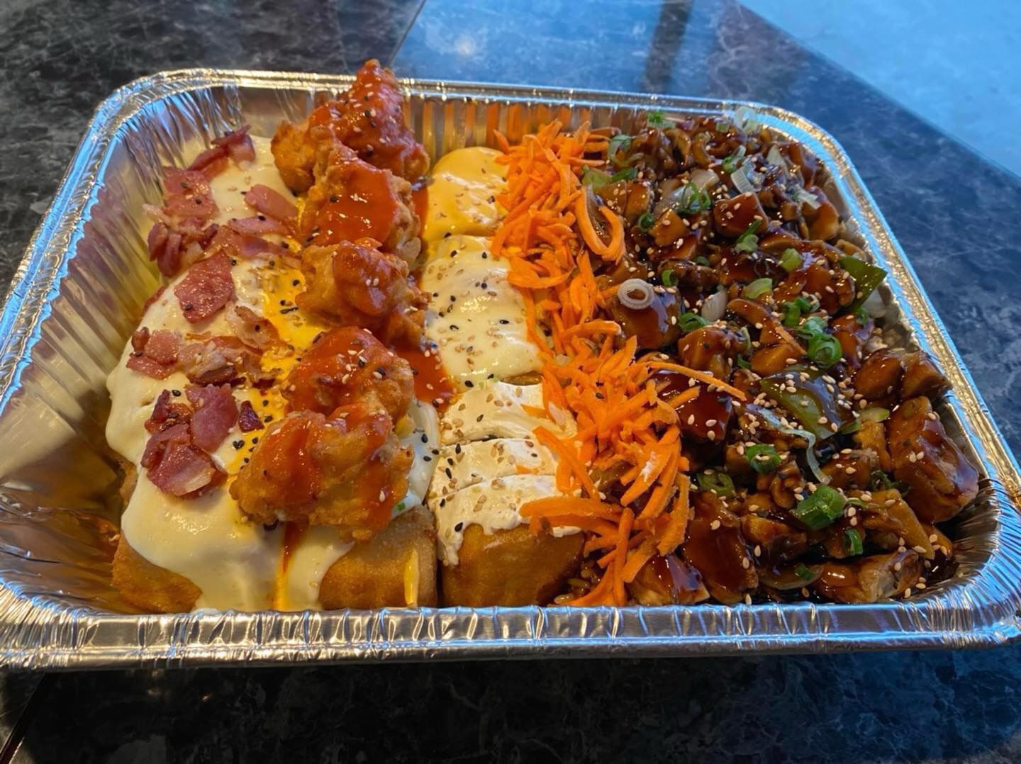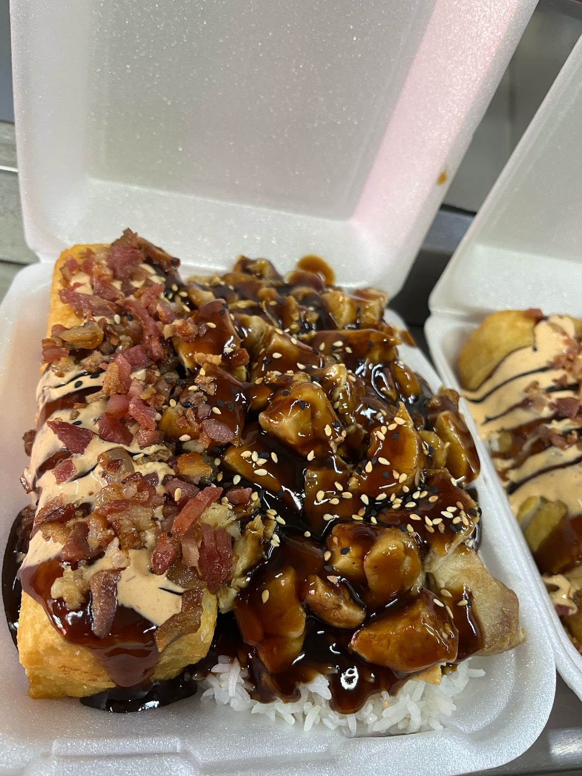 Arroz frito, , queso crema, aguacate, tampico y teriyaki de pollo.
