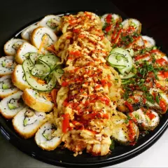 Media charola de teriyaki de pollo + dos rollos, un Ebi roll y Kanikama Roll Para 4-5 personas