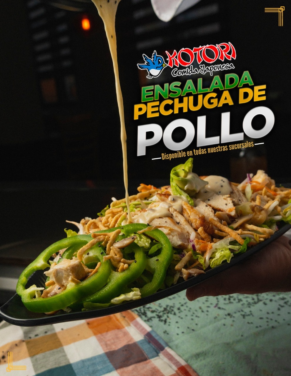 Ensalada verde con tiras de pechuga de pollo a la plancha, chop suey, tofu frito, champiñones, morrón verde, aguacate bañado con ajonjolí y acompañada con aderezo de mostaza.