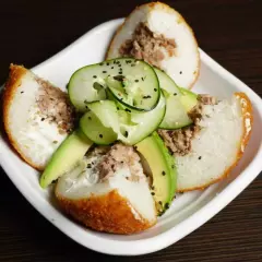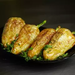 Pepino, carne de res y chile jalapeño por dentro empanizado por fuera gratinado de queso manchego trozos de tocino y aguacate.