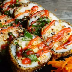 Camarón en tempura ,pepino,aguacate y queso crema,forrado con Tampico y topping de tiras de cebolla en tempura bañada con cebollín y salsa siracha anguila y spicy mayo
