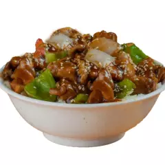 Tazón servido sobre una cama de arroz al vapor con chile morrón verde y cebolla, bañado con salsa teriyaki y ajonjolí.