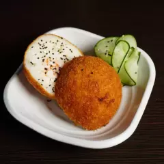 Bola de arroz grande empanizada , rellena con res, queso crema aguacate y ajonjolí