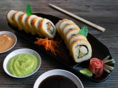 Camaron,pollo,res, aguacate,y pepino forrado de queso crema y cangrejo, empanizado