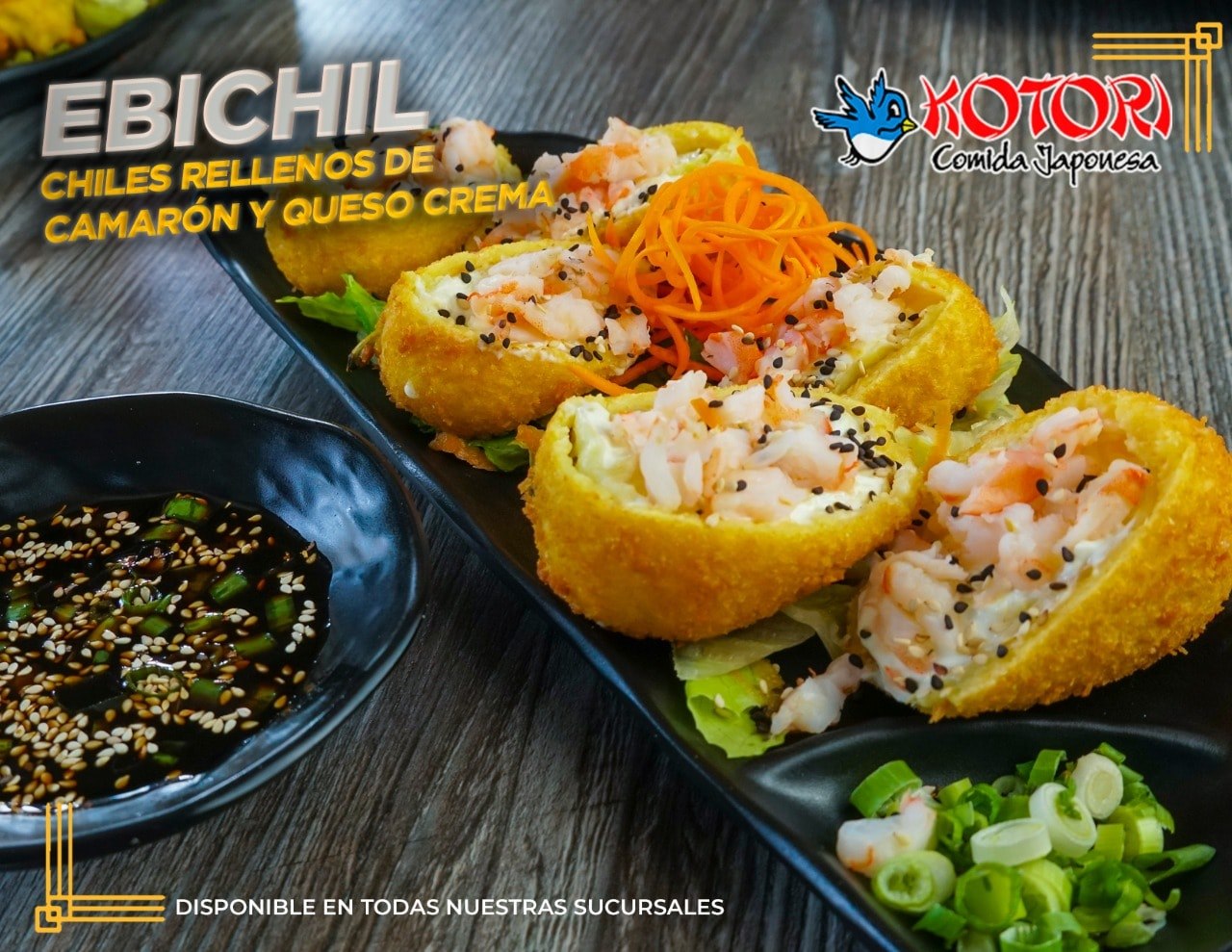 Pollo empanizado,aguacate,cebollín frito,forrado de queso crema y queso Monterrey,bañado con salsa chipotle y ajonjolí