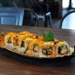 Camarón capeado, aguacate, pepino, surimi, bañado con salsa de anguila,spicy mayo, chipotle, hojuelas de tempura y ajonjolí