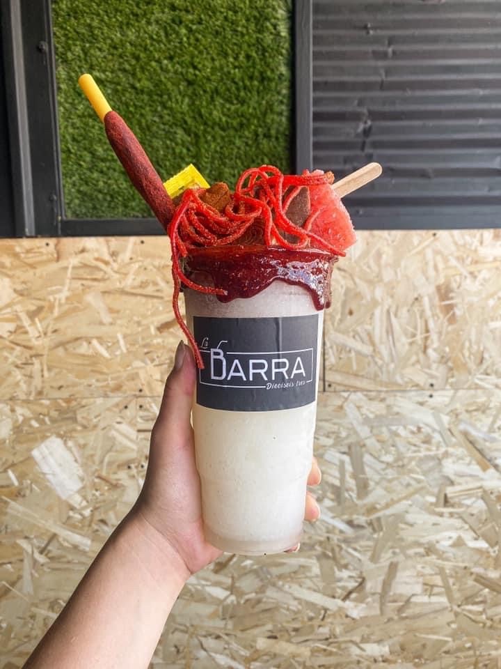 Limonada frappeada con escarchado de la casa, swinkles, pulparindo, serpentina, chakachaka, tarugo de tamarindo, pelón pelo rico y paleta de hielo sabor limón.