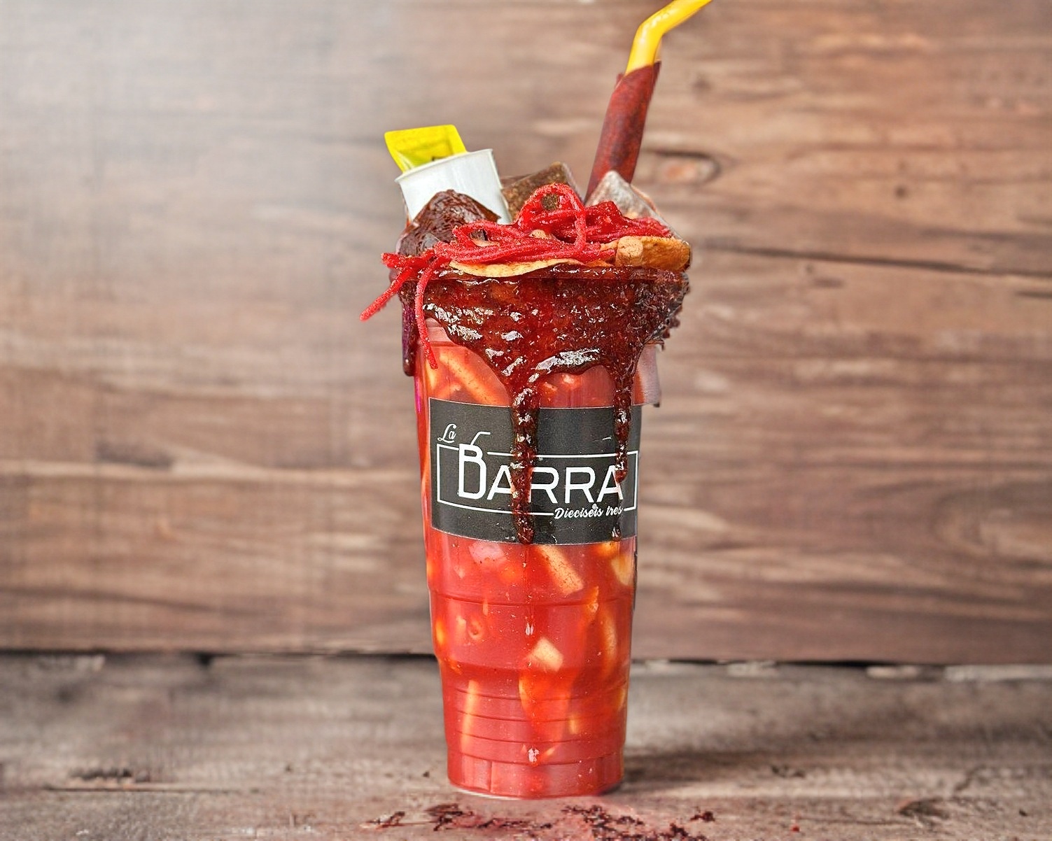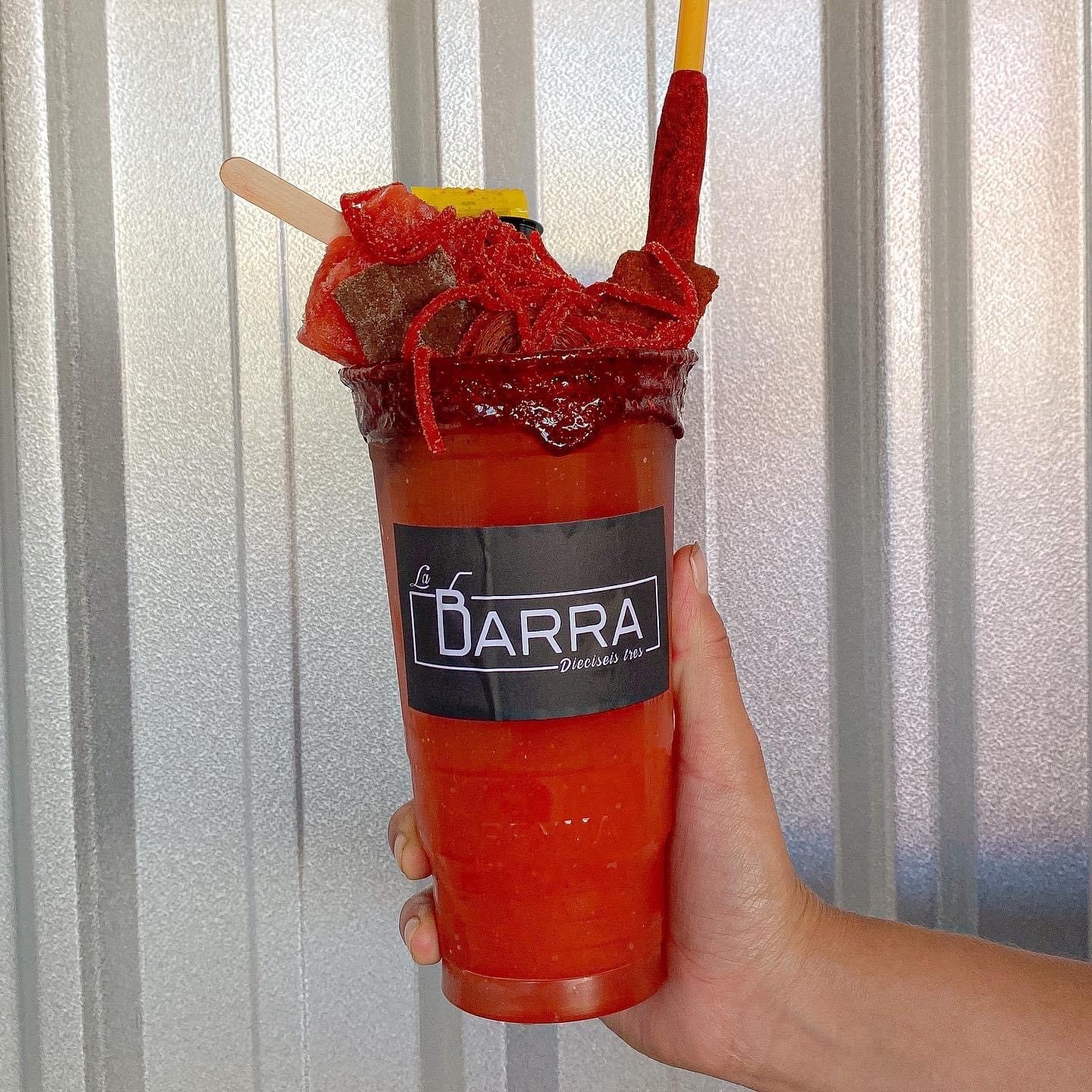 Clamato, salsas negras, limón, tajín, tarugo, apio y paleta de hielo sabor chamoy.
