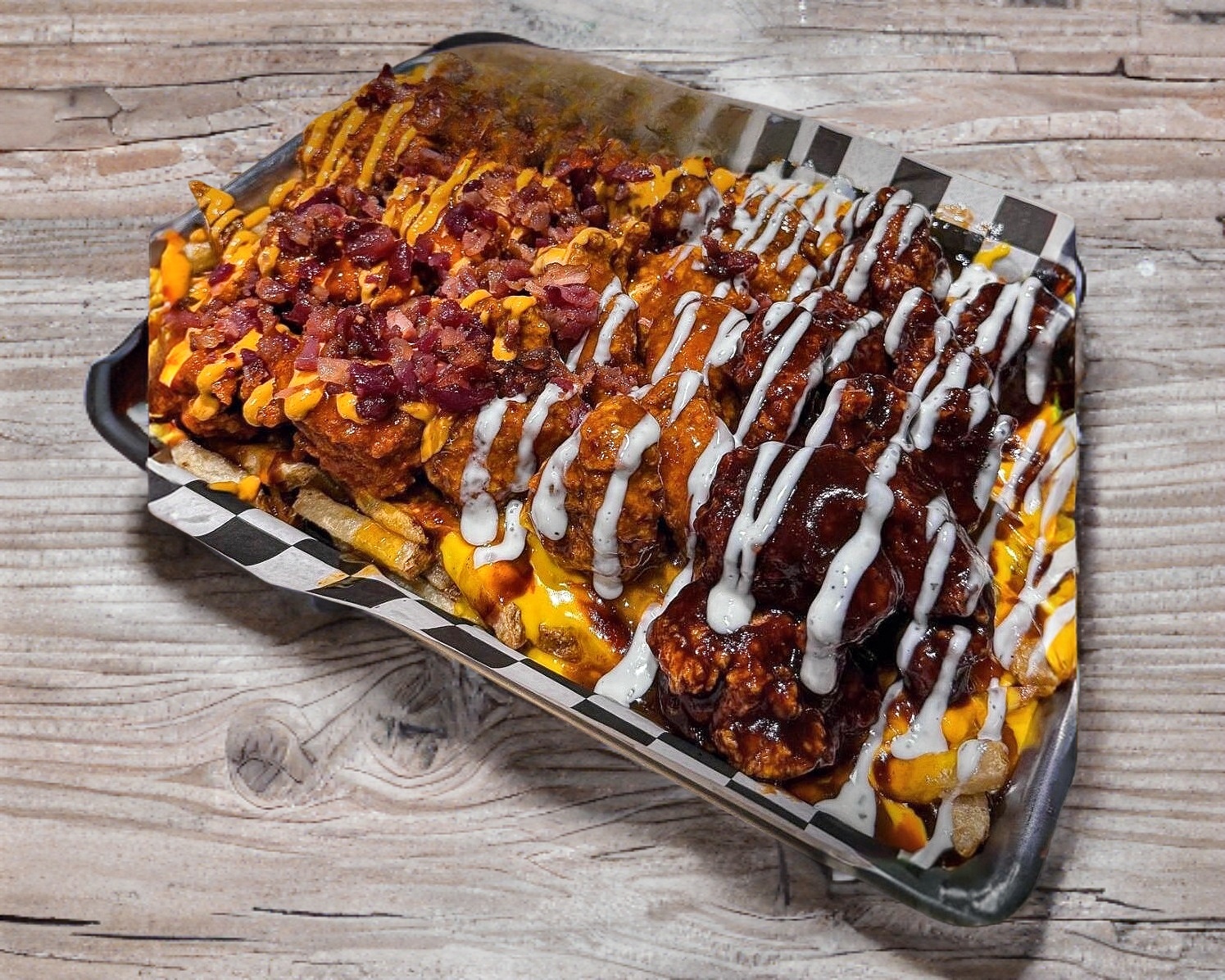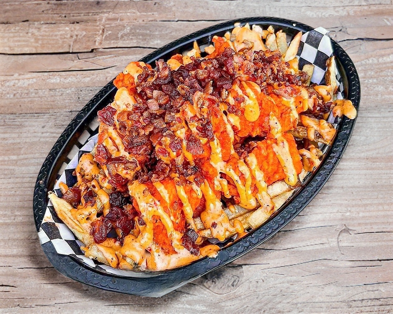 Papas fritas con queso, chipotle, crema y tocino.