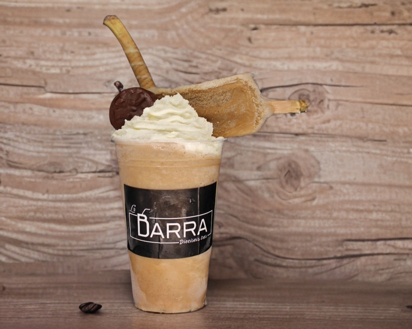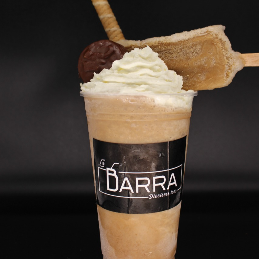 Frappé de moka, crema batida, popote de galleta y paleta de hielo sabor chocolate.