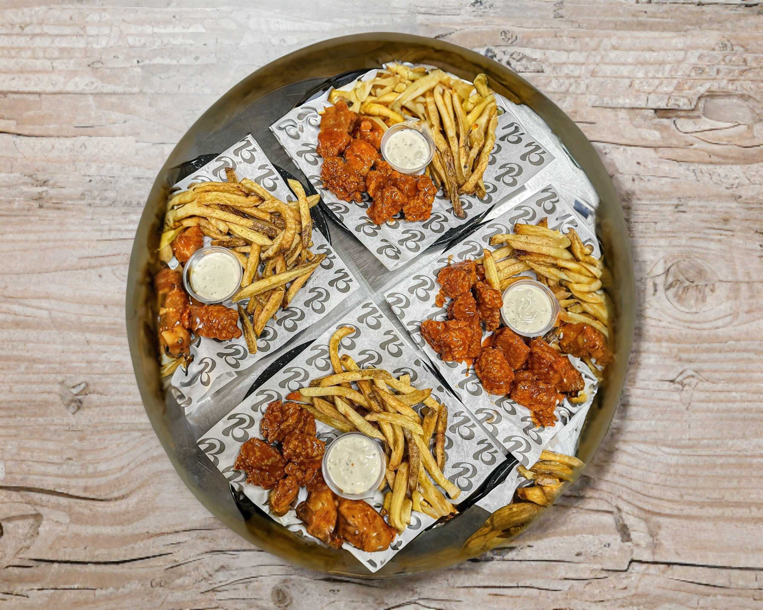 Boneless por 900 g, papas fritas, 15 aros de cebolla y 6 oz de aderezo ranch más kétchup.