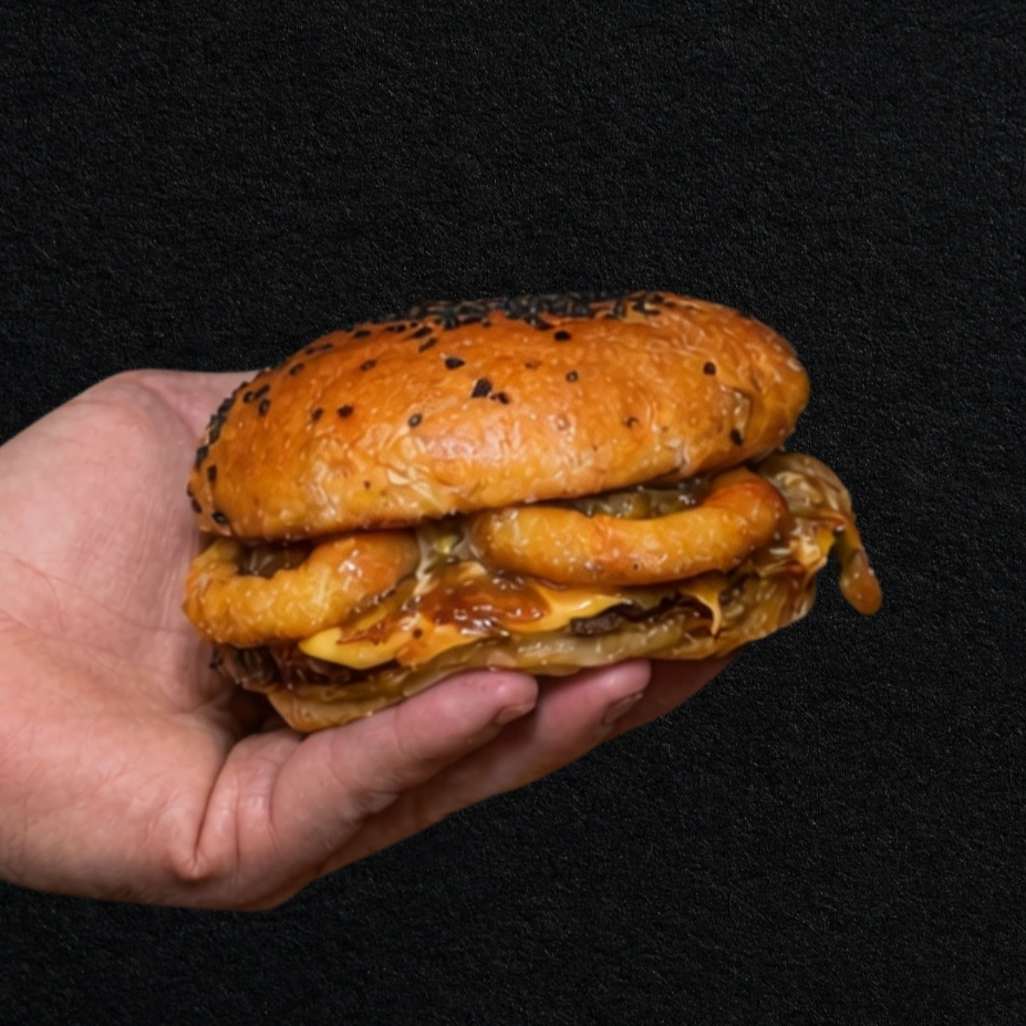 pan tipo brioche, carne 100% de res, queso amarillo, aderezo de la casa, aros de cebolla, y cebollas caramelizadas con jack daniels, acompañada de papas fritas y ketchup, sin duda será tu favorita!
