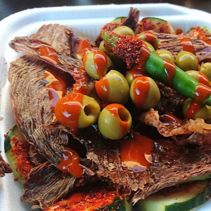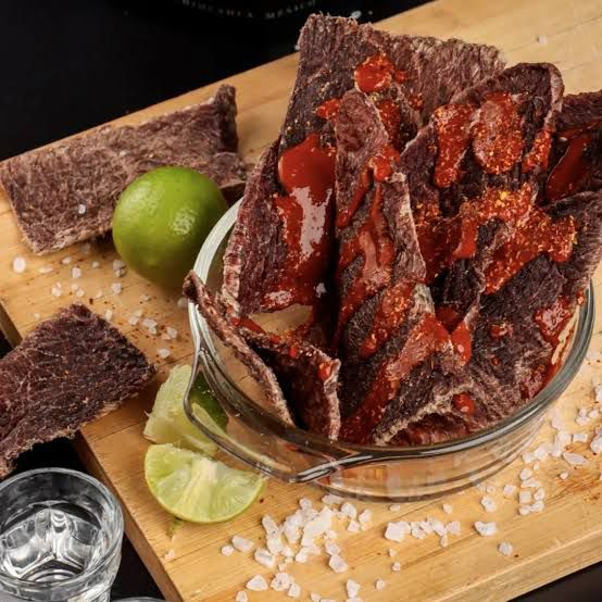 Deliciosa carne seca preparada con salsas negras, pepino, aceitunas, limón y tajín