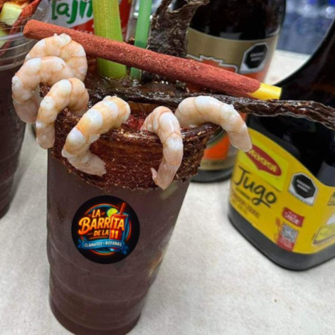Clamato preparado con camarón al borde, saladito, apio, carne seca, tarugo y nuestra deliciosa salsa de la casa