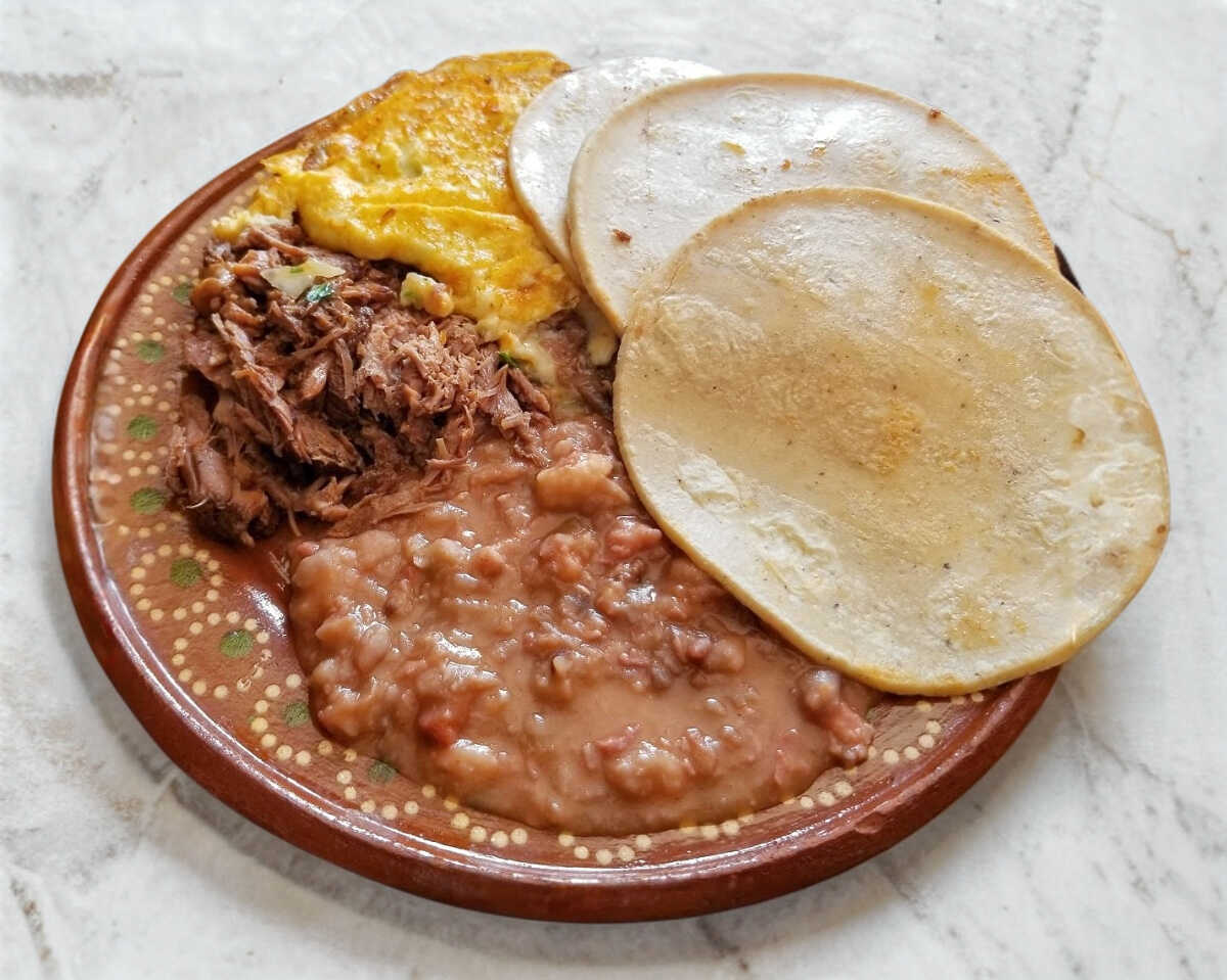 Omelette con queso y verdura dentro, birria, frijoles puercos y sus tortillas