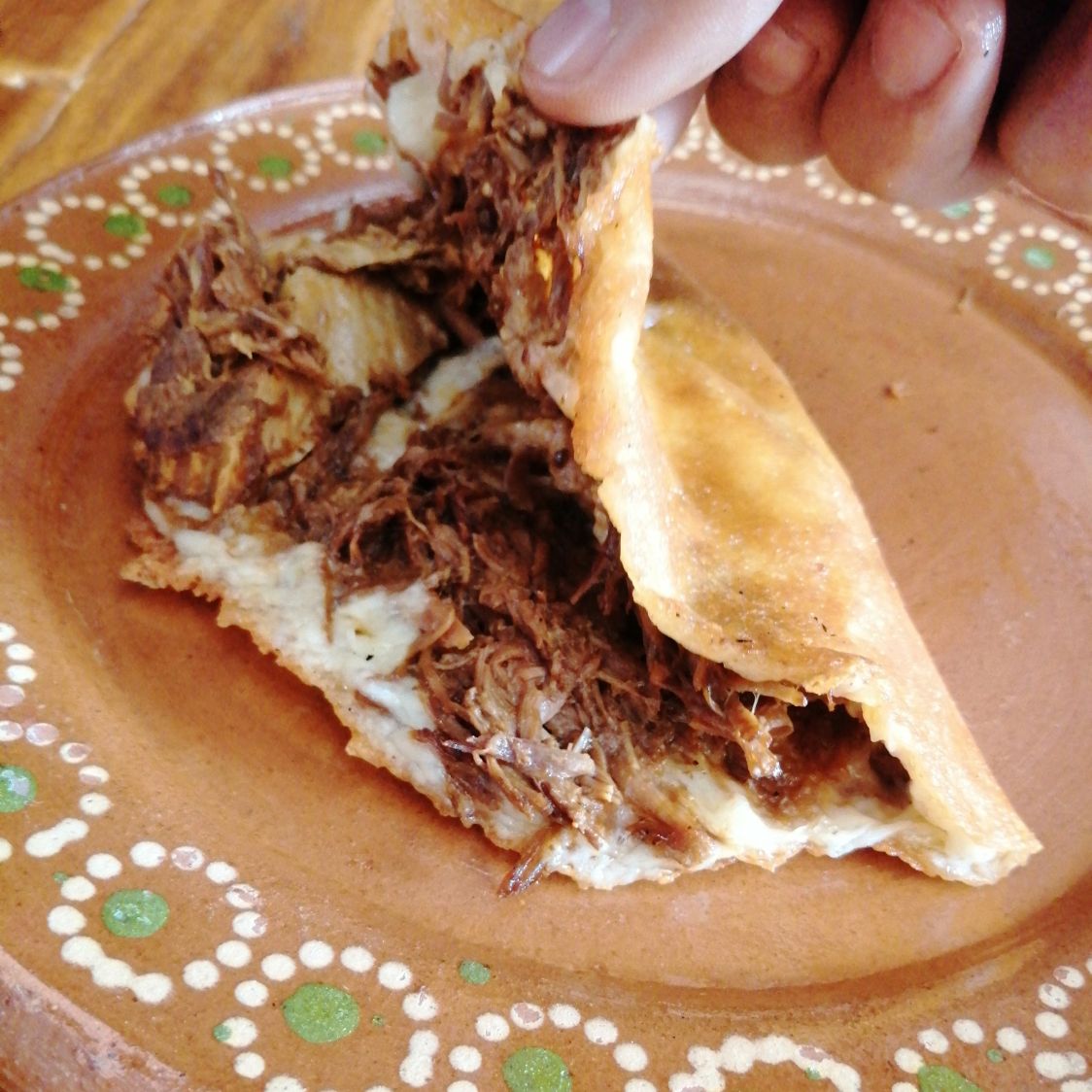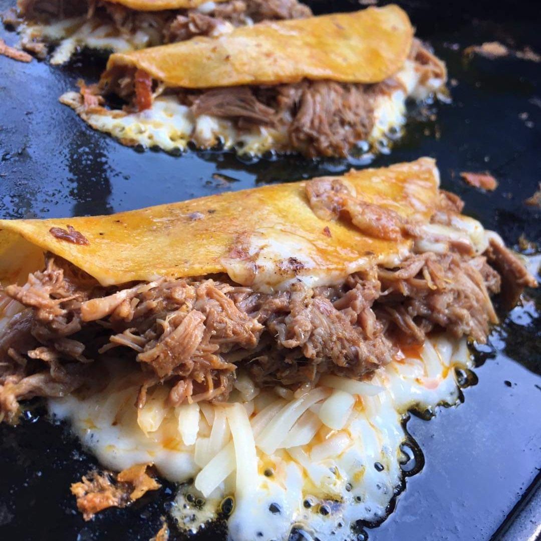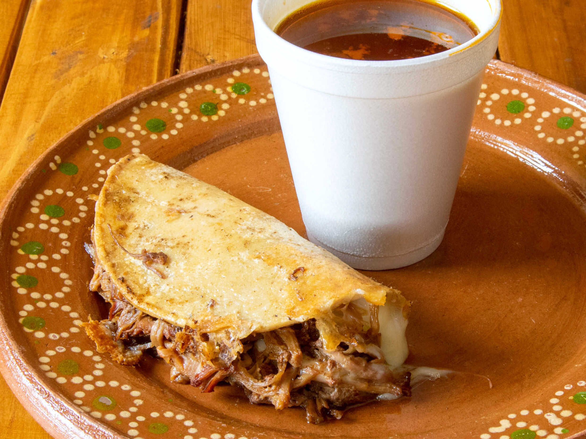 2 quesabirrias,con tortilla de maíz recién hecha, bebida al gusto,verdua,salsa,consome,frijol puerco.