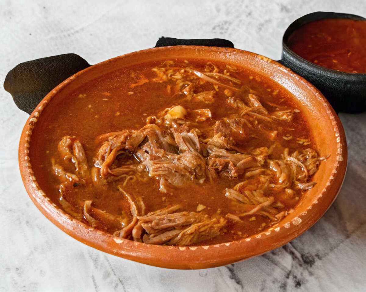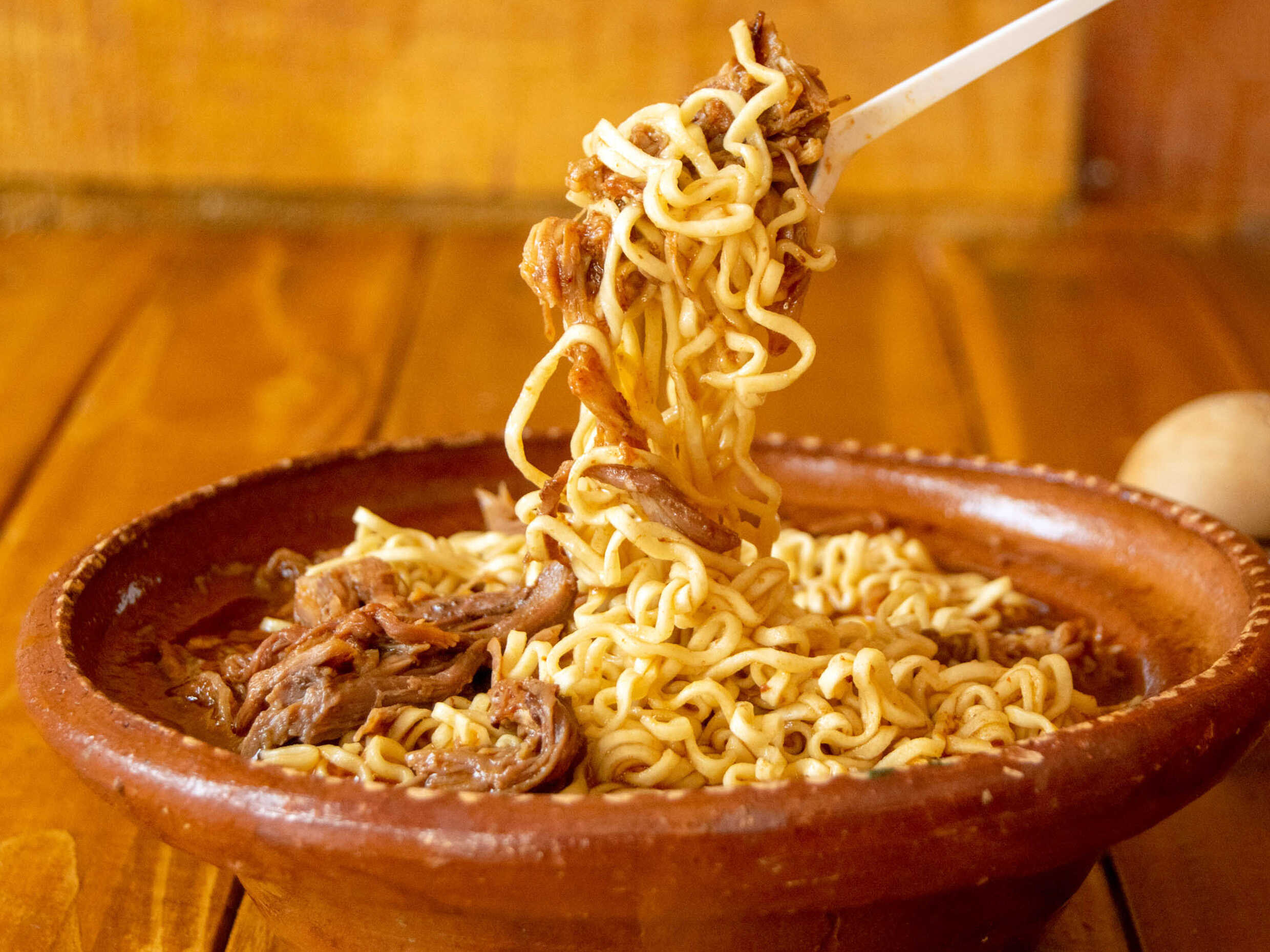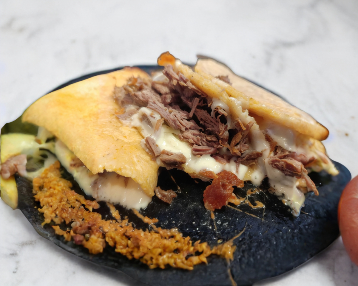 En vez de tortilla como la clásica,lleva gruesa costra de queso Monterrey y más grandeque la QUESABIRRIA clásica,acompañada con su verdura ,limón,salsa,consomé y frijol puerco.