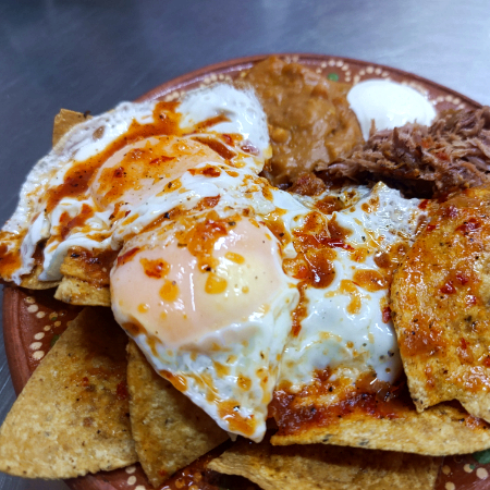 Chilaquiles con salsa de la casa,carne de birria,dos huevos,frijol puerco y crema