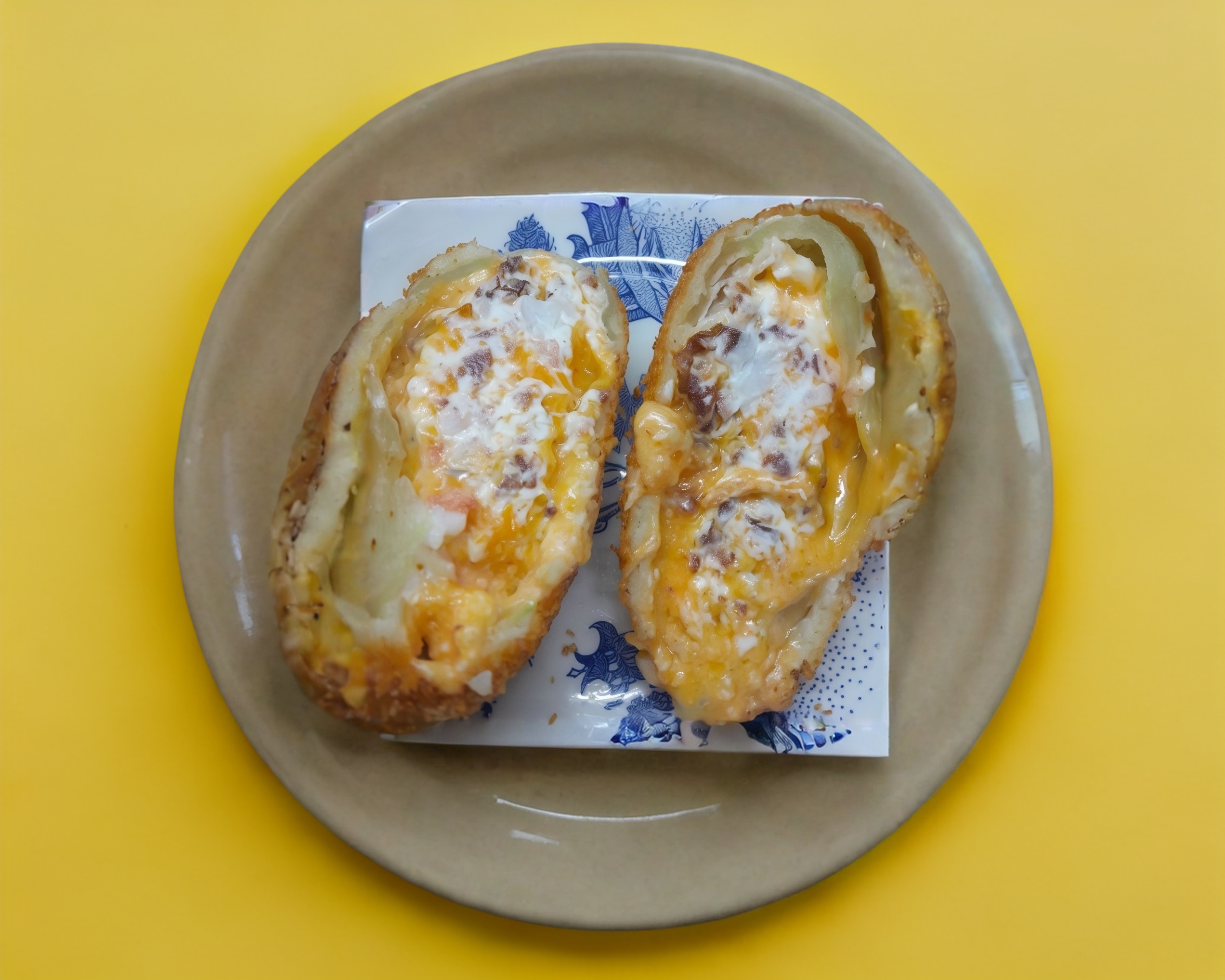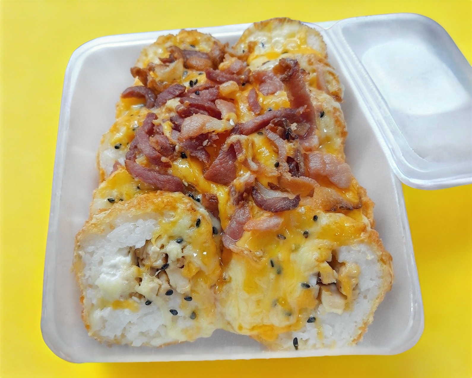 De pollo por dentro,aguacate,queso crema cubierto completamente de queso fundido con trozos de tocino