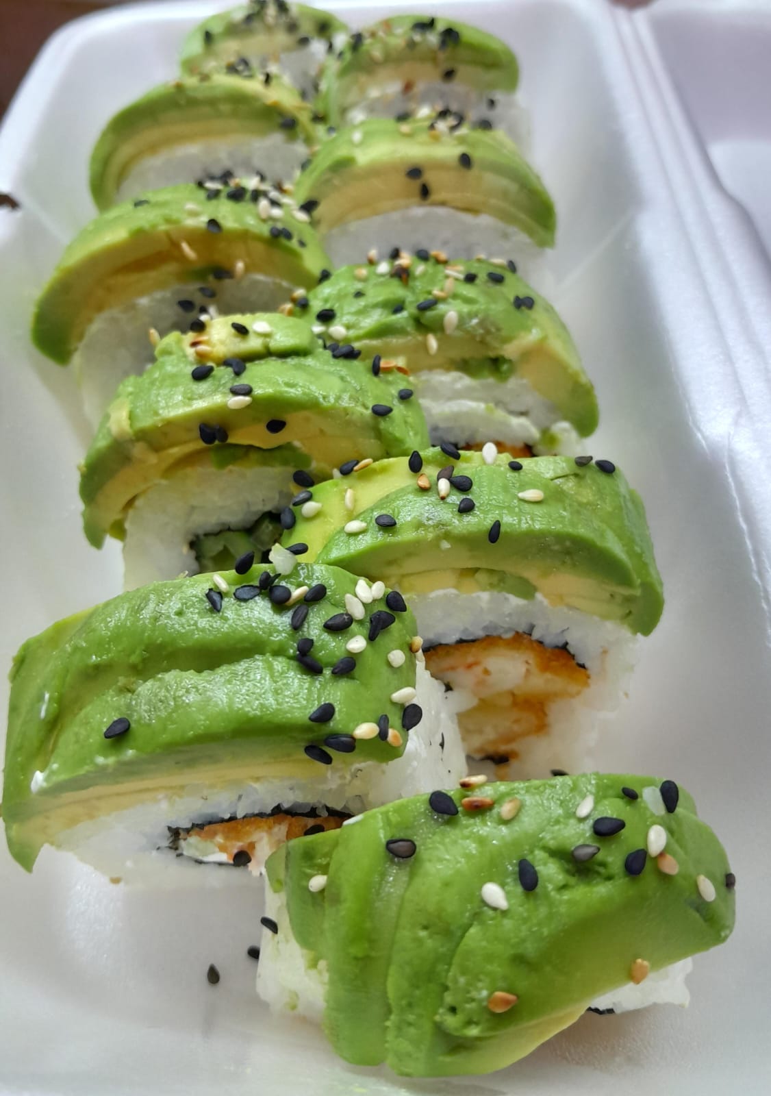 Camaron empanizado por dentro,pepino,queso crema forrado de aguacate
