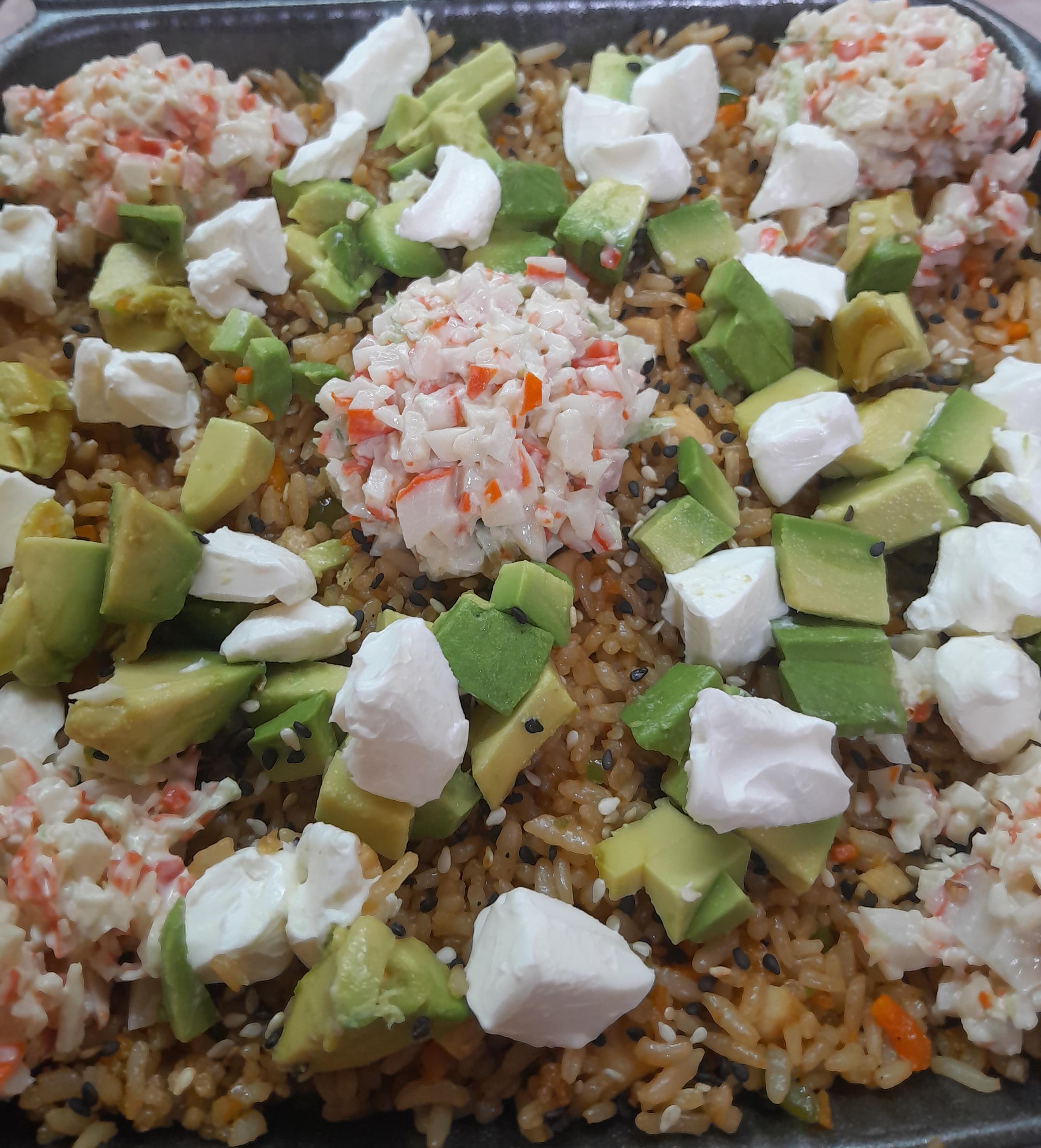 Arroz frito zanahoria,morron,cebolla finamente picadas con tampiko,queso crema y aguacate
