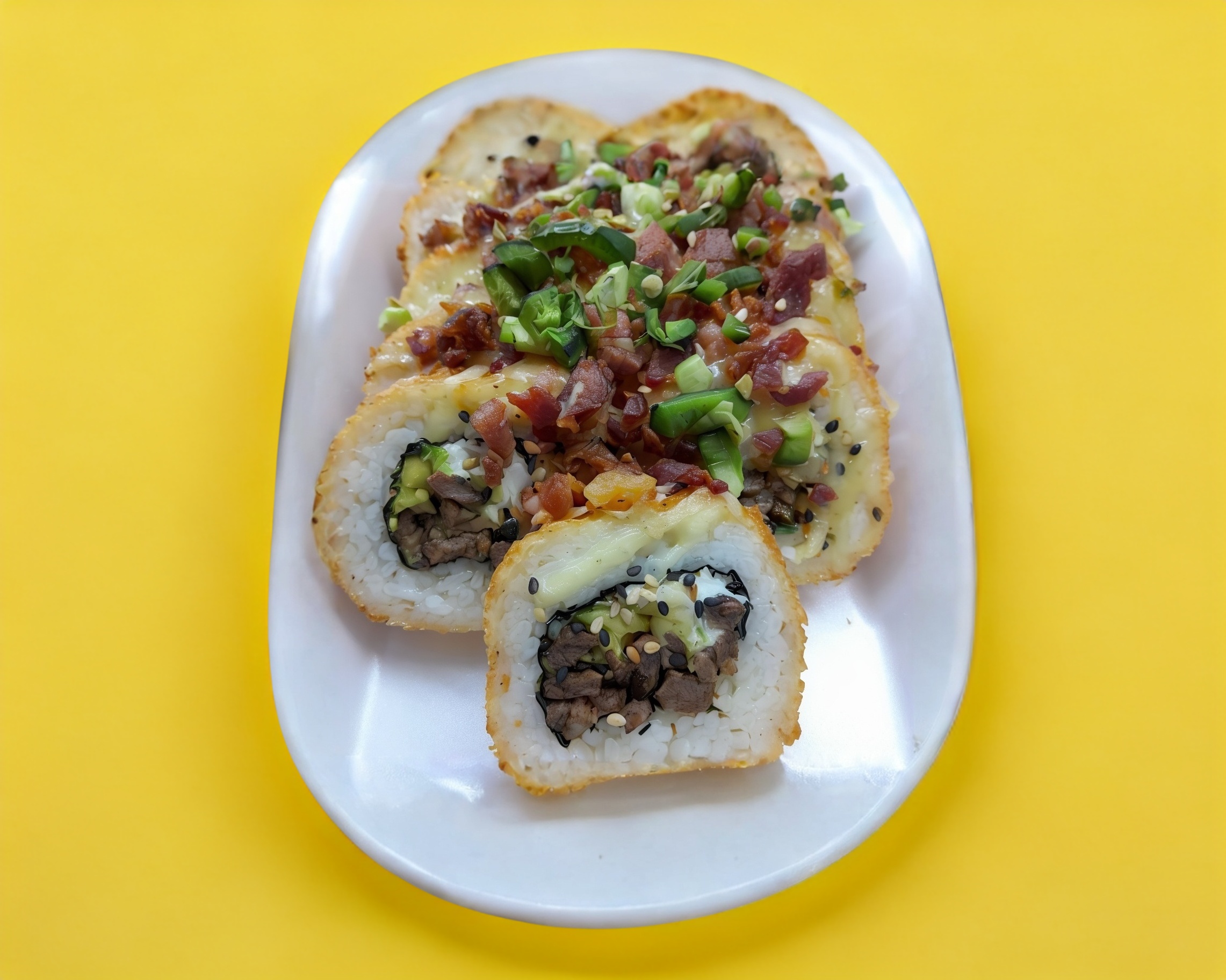 Arroz frito yakimeshi con verduras finamente picadas,cubierto de camaron empanizado cortado en trozos mas queso crema,tampiko y aguacate para 4 a 5personas
