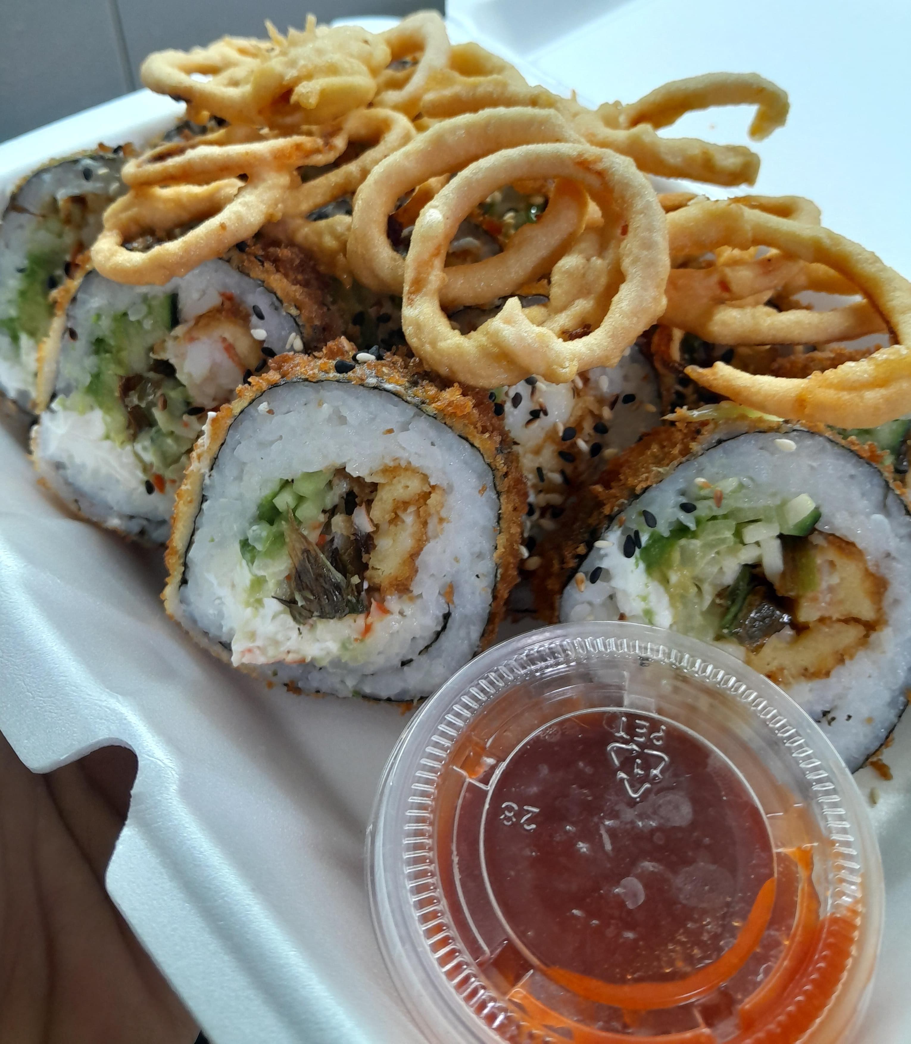 Camarón empanizado, tampico, philadelphia, aguacate, pepino, cebollín frito y una guarnición de zanahoria capeada. Bañado con salsa siracha con tabasco