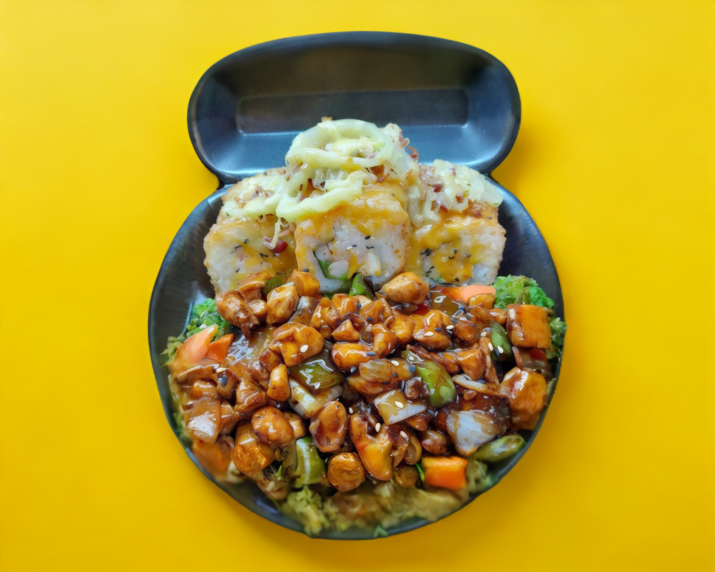 Medio rollo a elegir mas platillo de su elecion teriyaki,yakimeshi special,boneles,yakisoba,arroz cantones o yakidon, dentro de plato mediano