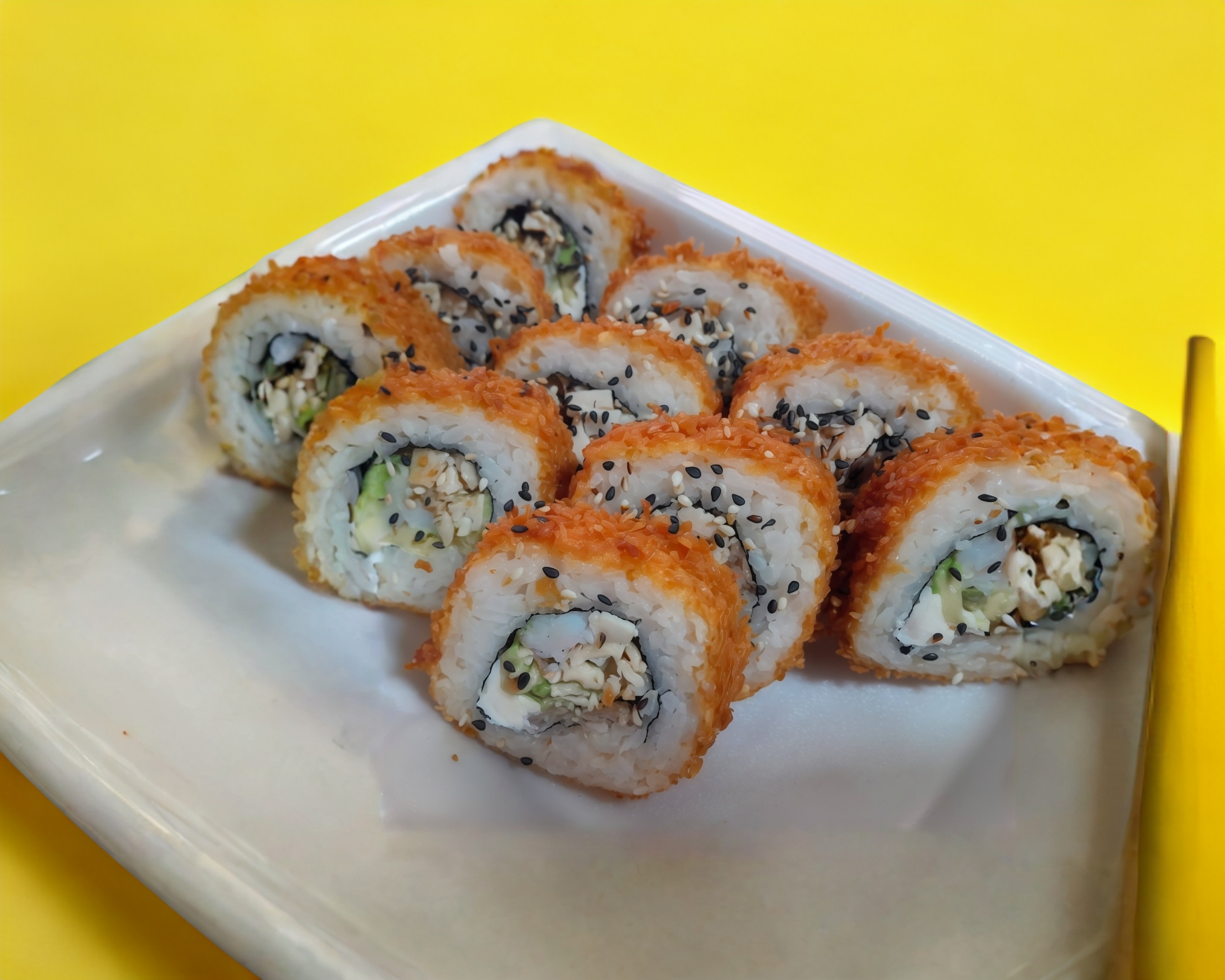 Camaron tempura,queso crema,pepino,aguacate acompañado con tampiko spicy y tiritas de surimi empanizadas